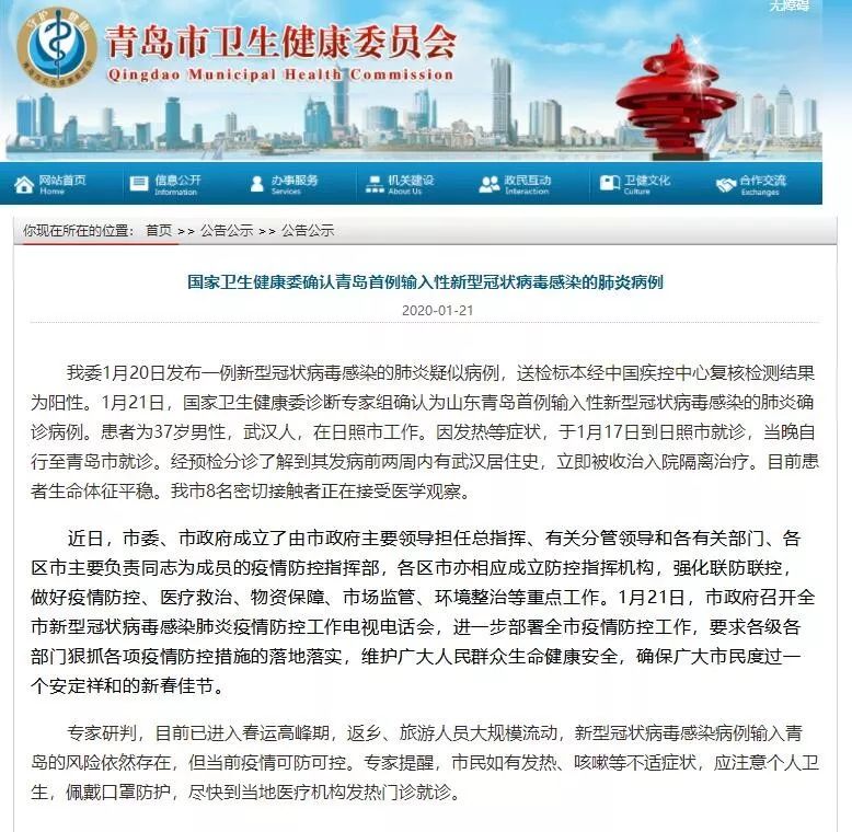 1月21日,青岛市卫生健康委发布公告,1月20日发布的一例新型冠状病毒感染的肺炎疑似病例,送检标本经中国疾控中心复核检测结果为阳性。1月21日,国家卫生健康委诊断专家组确认为山东青岛首例输入性新型冠状病毒感染的肺炎确诊病例。