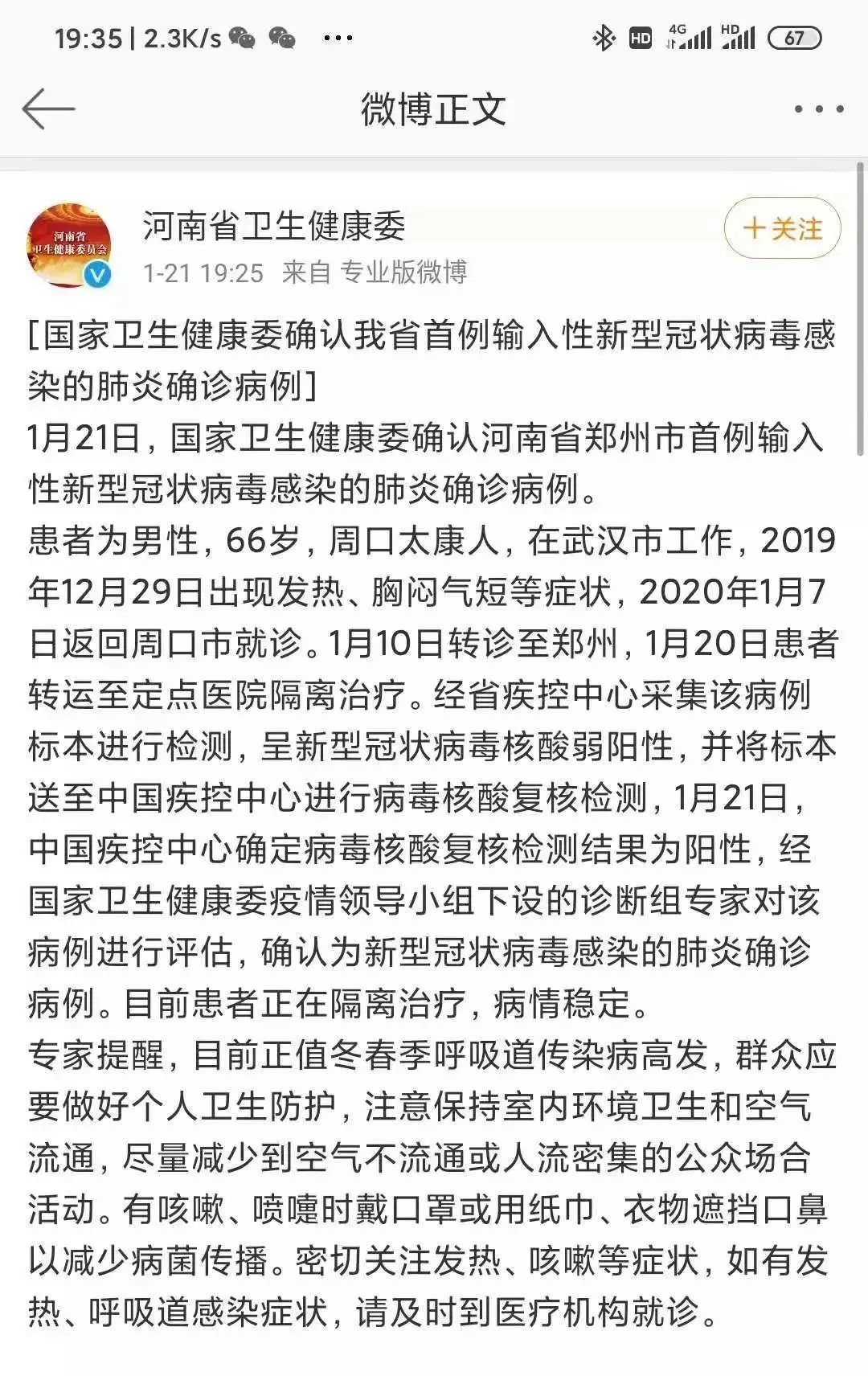 1月21日晚,记者从河南省卫生健康委官方微博获悉,1月21日,国家卫生健康委确认河南省郑州市首例输入性新型冠状病毒感染的肺炎确诊病例。