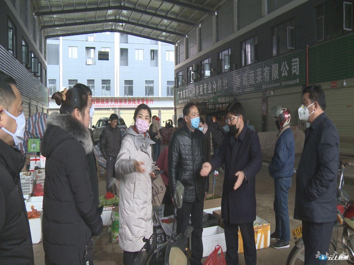 会后,黄继军深入到渡蚁桥农贸市场、南门锦诚农贸城检查防控工作。他要求进一步强化源头管控,强化农贸市场的清洁、消毒、通风,严禁活禽交易,严禁非法养殖、加工、经营各类野生动物行为。在麻竹高速出口体温监测点,黄继军仔细了解了监测人员部署、工作运行机制和初检数据统计情况,并看望慰问了现场的医护人员和民警,叮嘱他们在做好监测工作、把好疫情第一道防线的同时,做好自我防护。在广水天成医疗科技制品有限公司,黄继军了解了口罩等医疗物资储备保障情况,要求全面落实配套保障措施,加强药品、医疗器械以及食品蔬菜的生产、储备和供应,为医疗救治和疫情防控提供有力保障,全力维护社会正常生产生活秩序。
