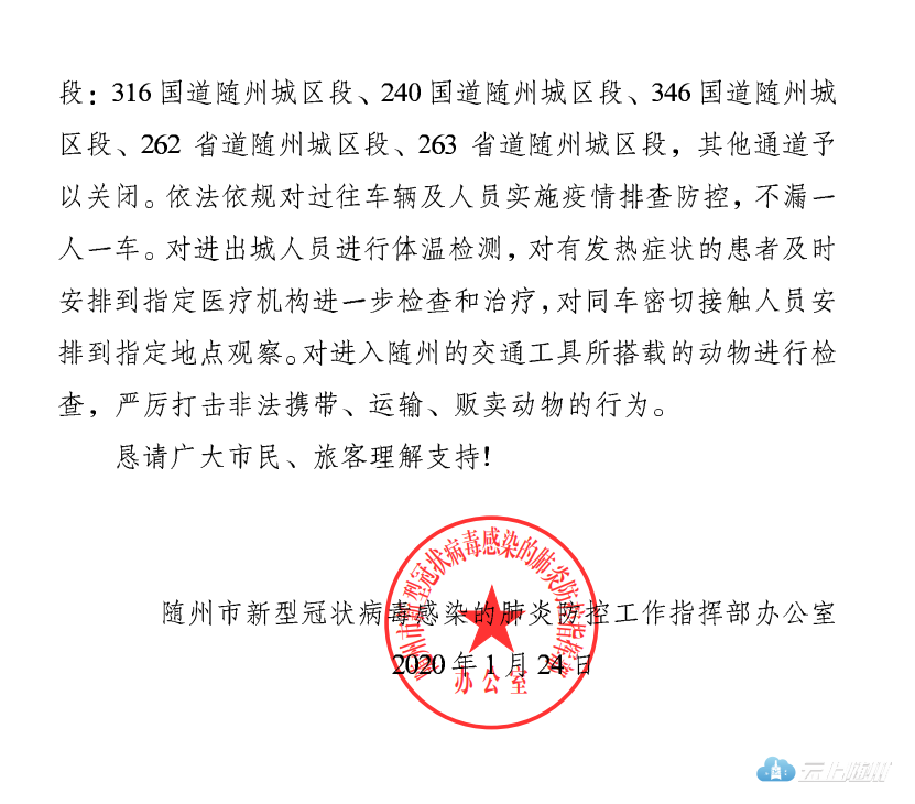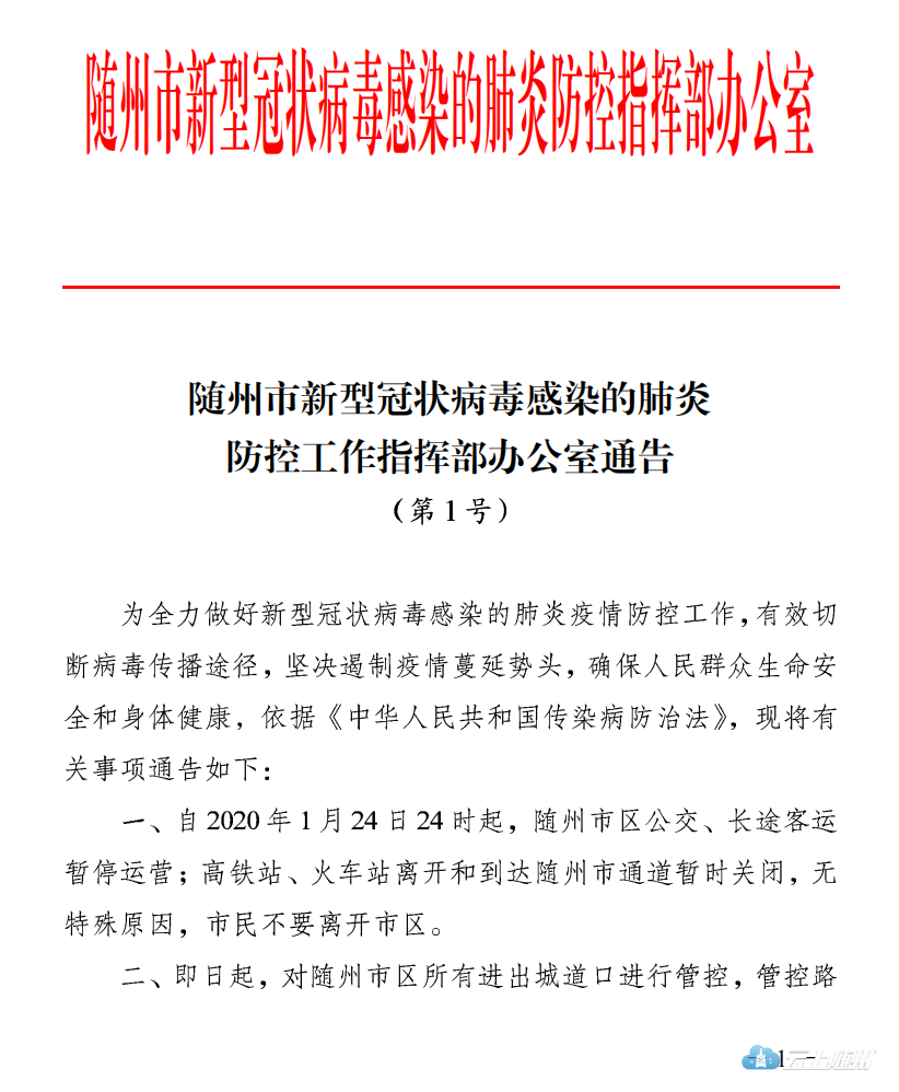 随州市新型冠状病毒感染的肺炎 防控工作指挥部办公室通告(第1号)