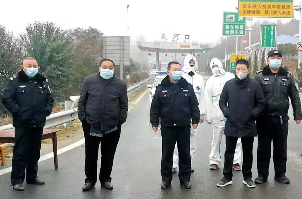 1月25日,殷店镇主要负责人带领派出所、卫生院等单位工作人员坚守岗位,继续开展疫情防控工作,查控进出车辆。(熊九龙)