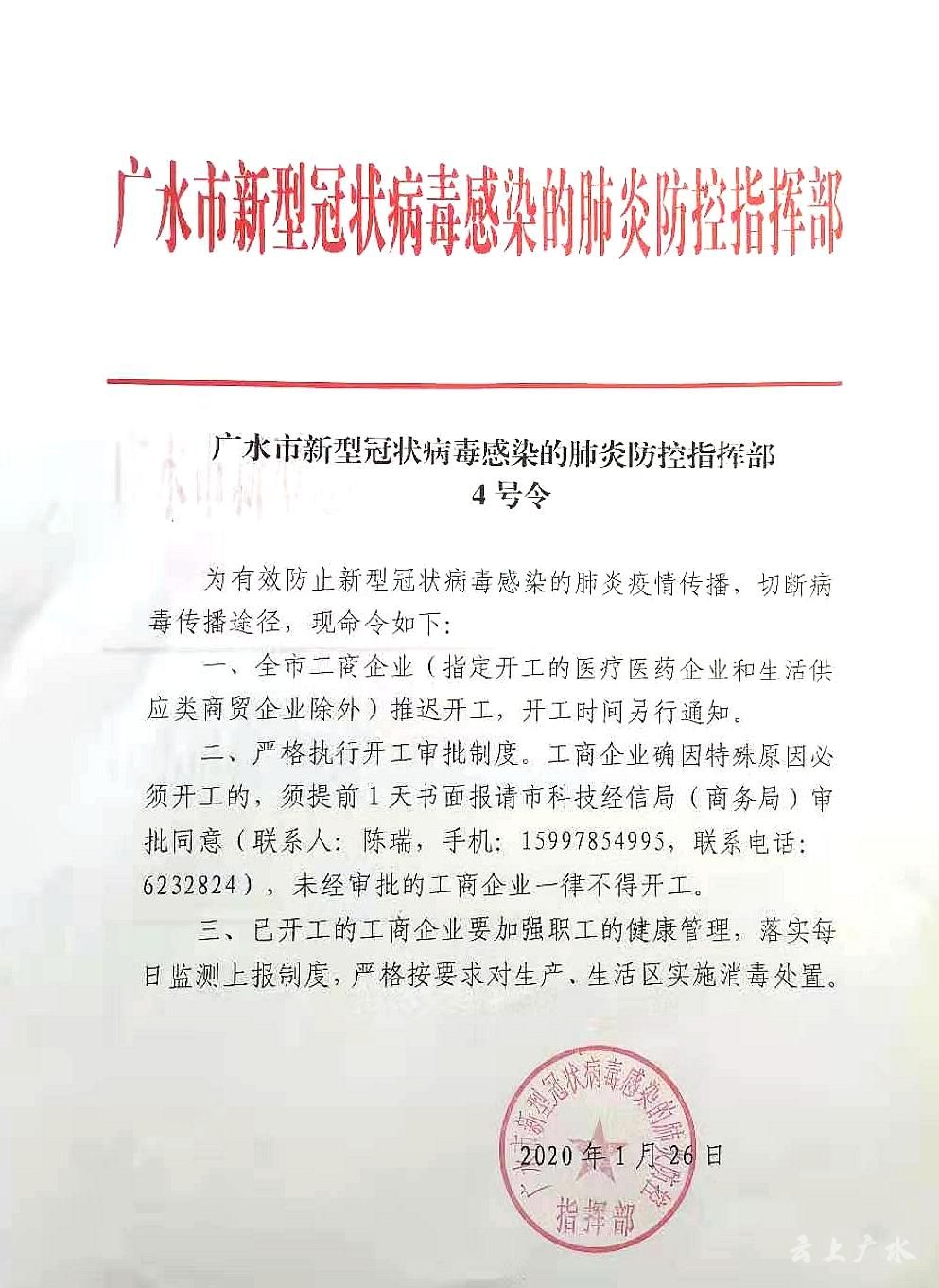 广水市新型冠状病毒感染的肺炎防控指挥部(4号令)