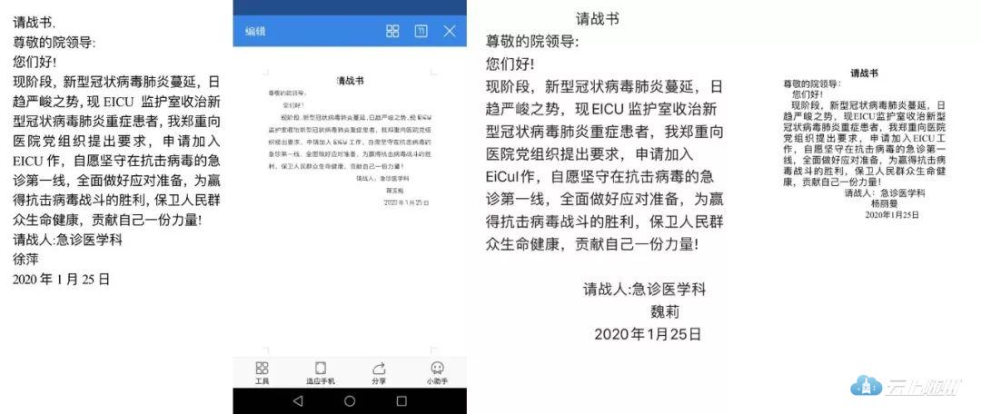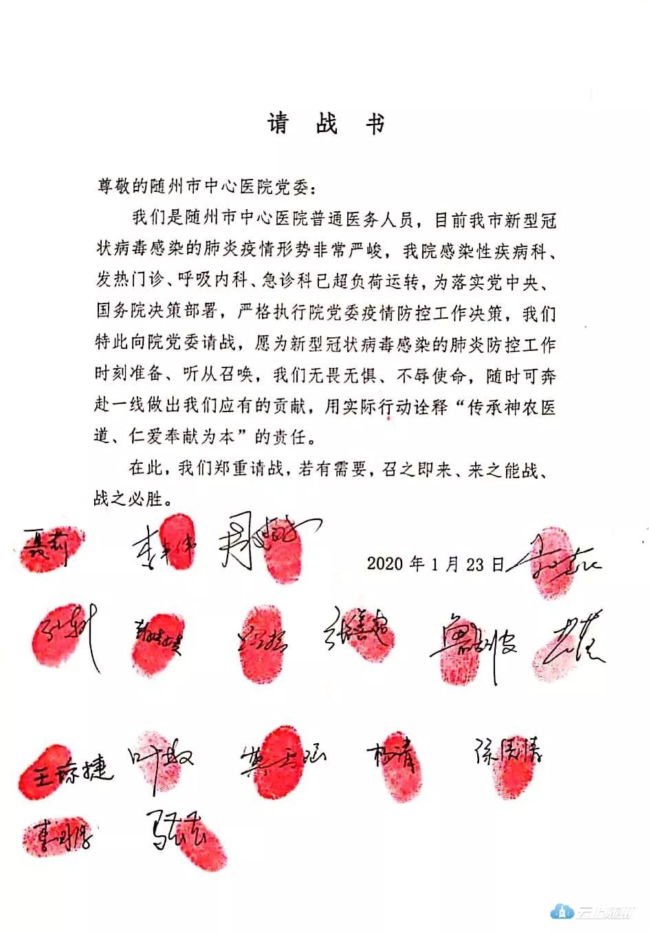 请战书里,他们写道:“我们是随州市中心医院普通医务人员,目前我市新型冠状病毒感染的肺炎疫情形势非常严峻,我院感染性疾病科、发热门诊、呼吸内科、急诊科已超负荷运转,为落实党中央、国务院决策部署,严格执行院党委疫情防控工作决策,我们特此向院党委请战,愿为新型冠状病毒感染的肺炎防控工作时刻准备、听从召唤,我们无畏无惧、不辱使命,随时可奔赴一线做出我们应有的贡献,用实际行动诠释“传承神农医道、仁爱风奉献为本”的责任。在此我们郑重请战,若有需要,召之即来、来之能战、战之必胜。”