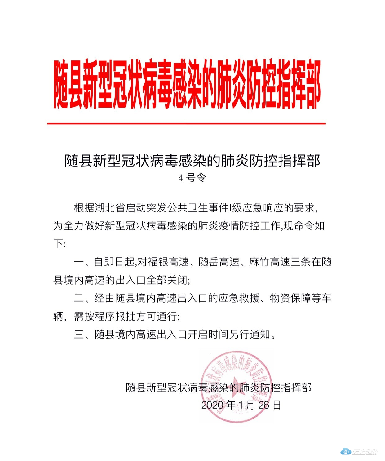 权威发布!随县新型冠状病毒感染的肺炎防控指挥部4号令