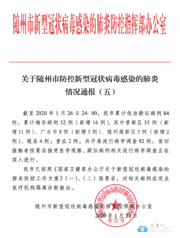 【权威发布】关于随州市防控新型冠状病毒感染的肺炎情况通报(五)