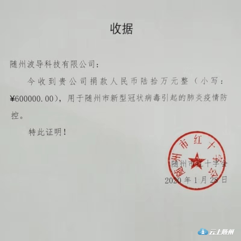 目前,武汉市新型冠状病毒感染的肺炎疫情波及全国,随州形势也十分严峻。生命重于泰山,疫情牵动着亿万人民的心,随州波导科技有限公司勇于担当、主动作为,1月28日,向随州市红十字会捐款60万元,主要用于新型冠状病毒肺炎的疫情防控、治疗和参与治疗的医护人员补助慰问。
