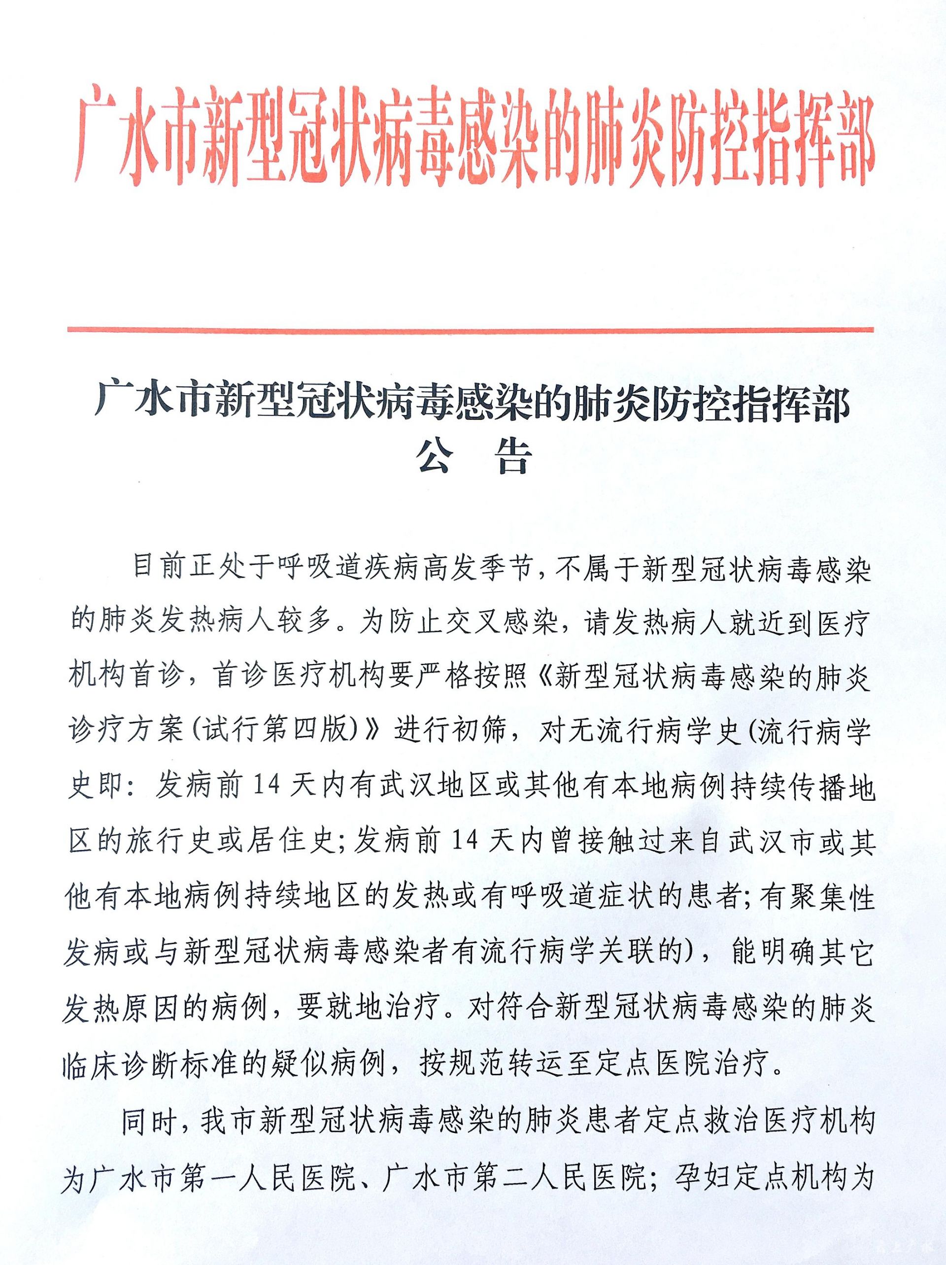 广水市新型冠状病毒感染的肺炎防控指挥部公告