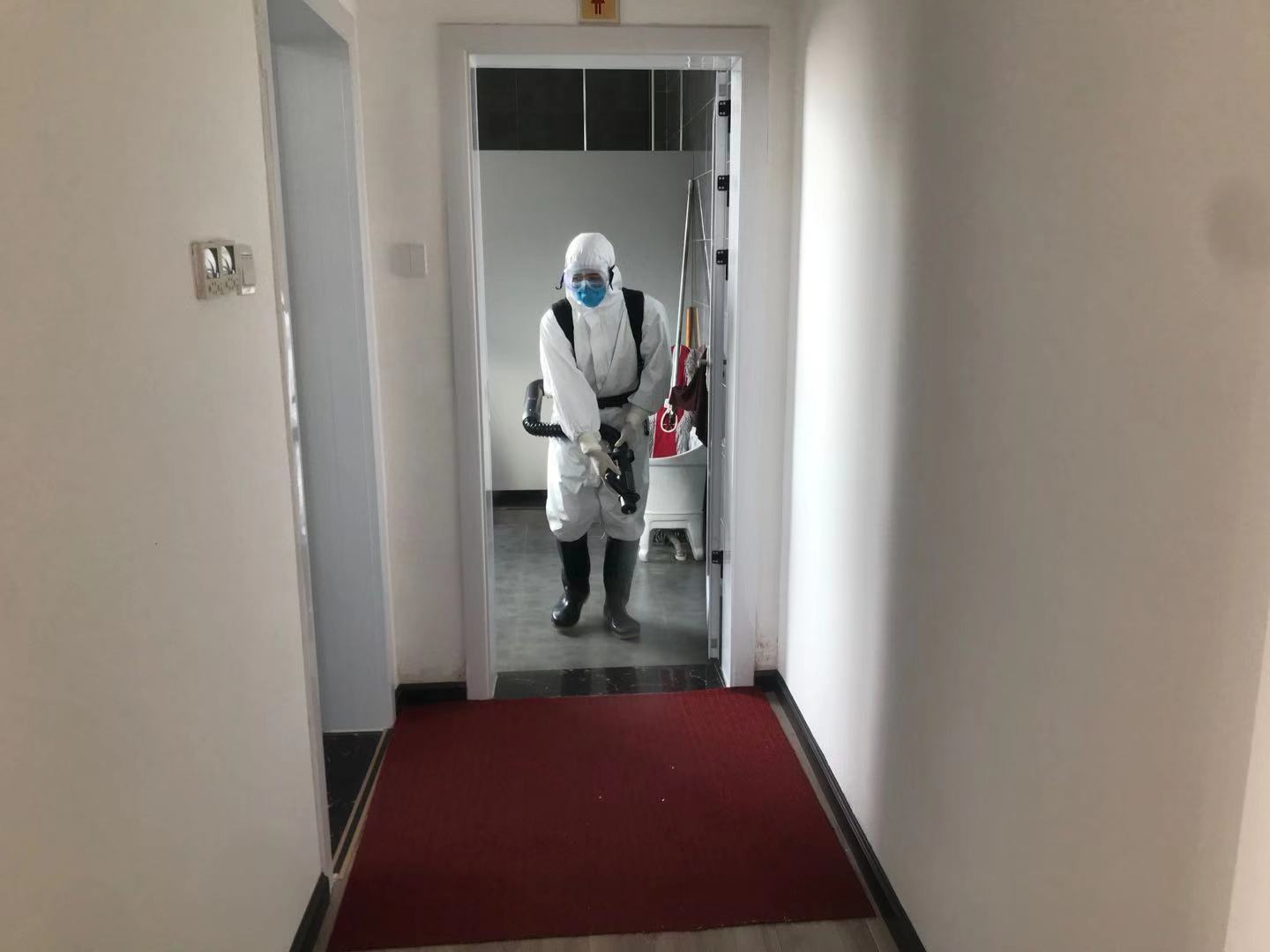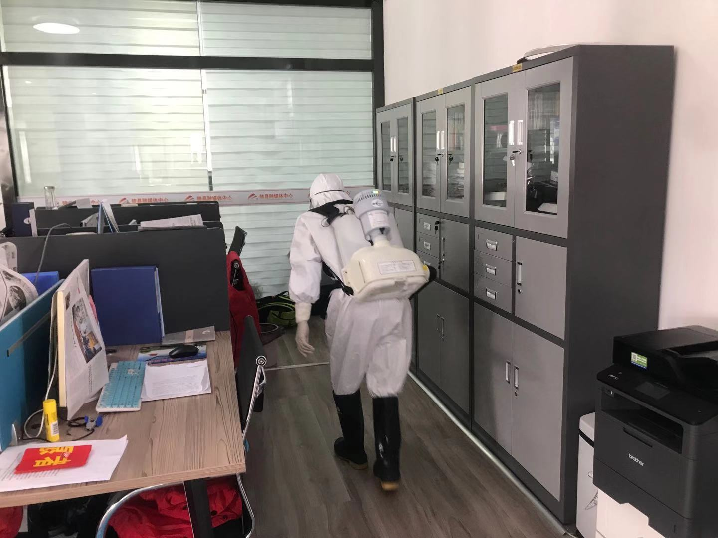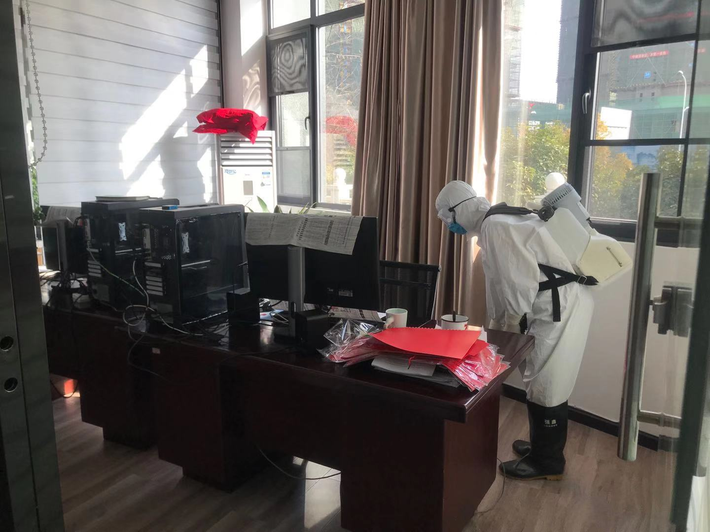 1月30日,他全副武装来到随县融媒体中心执行消毒任务。喷雾器呼呼作响,肖雄手脚麻利,把每个房间的角角落落喷洒一遍。“喷洒的是过氧乙酸消毒液,是专门针对新型冠状病毒配置的。”肖雄说,他是随县疾控中心员工,根据单位安排执行任务,从大年三十开始,每天从早上6点干到晚上10点,可以完成七、八家单位的消毒任务。