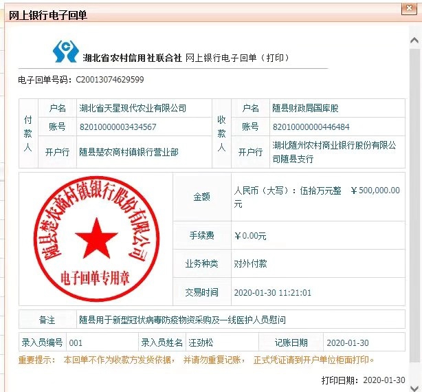 抗击疫情,人人有责。1月30日,湖北省天星现代农业有限公司向随县红十字会捐赠50万元,用于抗击新型冠状病毒感染的肺炎疫情,这是截至目前随县红十字会接收到金额最大的一笔善款。