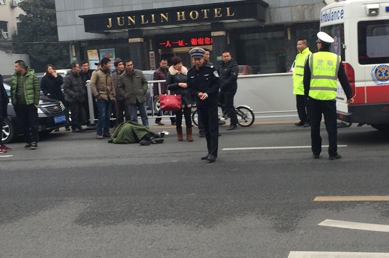 12月13日上午9点半左右在随州市老火车站发生一起车祸。事故地点位于老火车站君临大酒店正门口前的马路中央,记者赶到时只看到一辆黑色的轿车停在路中央,前方有一位倒在地上的中年妇女,周围有三三两两的群众,不远处停着赶来处理案件的警车。民警正在询问当事人案件的具体情况,由于天气寒冷的缘故中年妇女倒地后有好心人拿来了厚重的军大衣为其盖上等待救护车的救援。