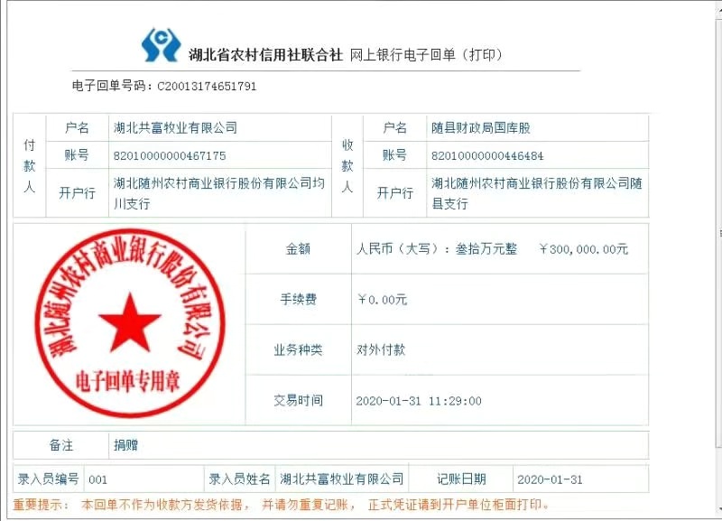 面对严峻的疫情防控形势,随县企业家积极参与抗击疫情,履行社会责任,为随县提供正能量 。 1月31日,湖北共富牧业公司向随县红十字会捐赠善款30万元,专项用于抗击新型冠状病毒感染的肺炎疫情工作。 编辑:刘欣明 责编:钱思雪 审核:陈凡 鲁京京