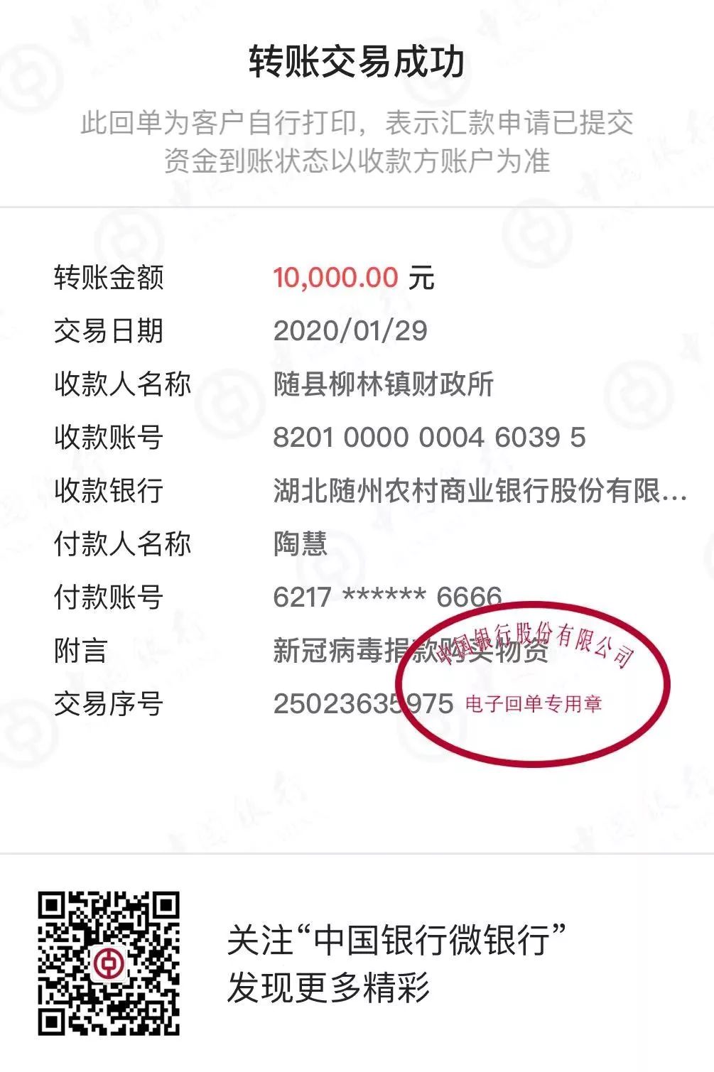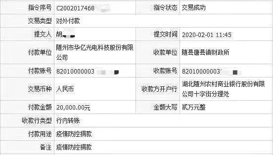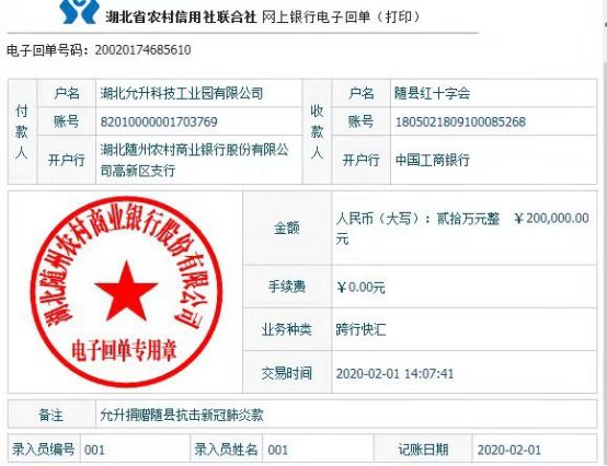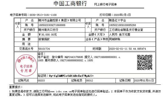 2月1日,随县红十字会收到随州市玉龙供水有限公司捐款5万元,随州市金融控股集团有限公司捐款3万元,湖北允升科技工业园有限公司捐款20万元。(张明才)