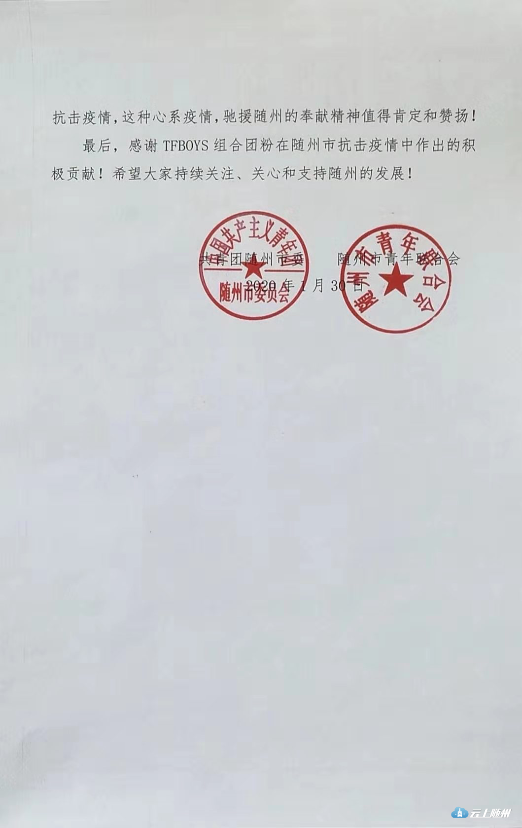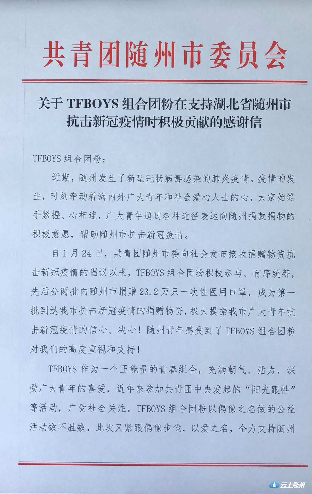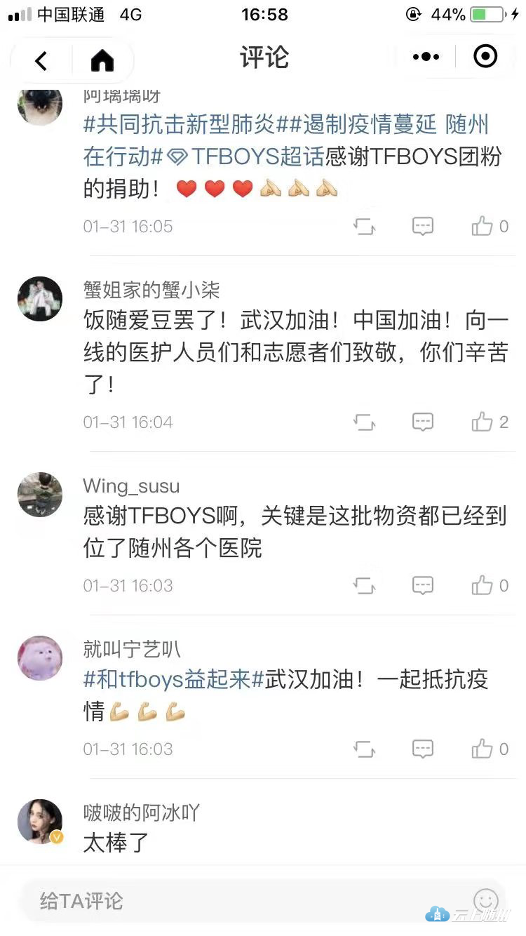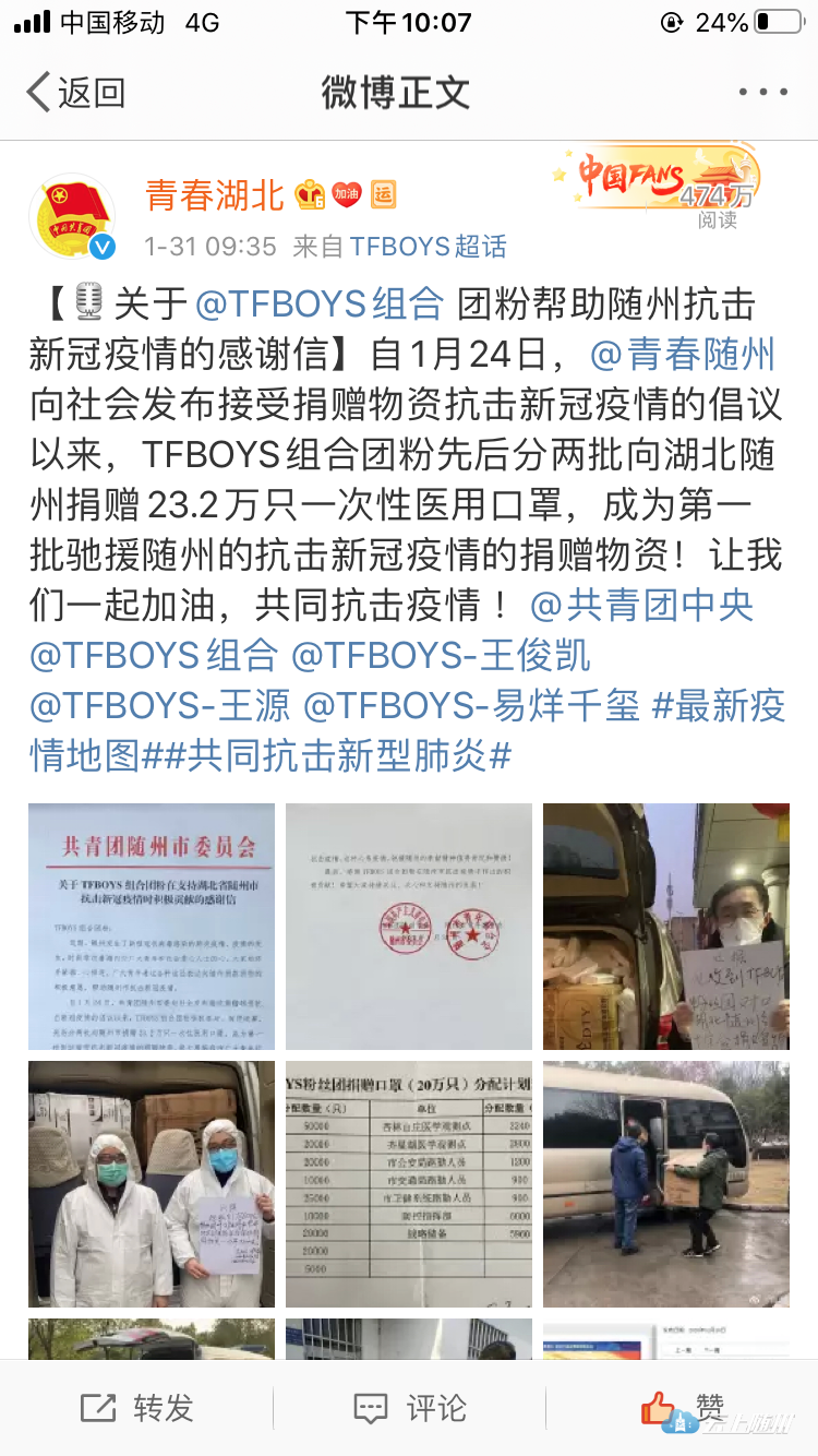 连日来,共青团随州市委动员TFBOYS组合团粉募集医疗物资帮助随州抗击新型冠状病毒感染的肺炎疫情,“饭圈女孩”出征,TFBOYS组合团粉以偶像之名热心公益活动,分两批向湖北随州捐赠23.2万只一次性医用口罩,并协调武汉市烟斗群联合健发科技捐赠10吨高浓度消毒水,这些捐赠成为第一批驰援随州的医疗物资,为随州抗击疫情做出了积极贡献。1月31日,共青团随州市委、随州市青年联合会通过“青春随州”官方微博向TFBOYS团粉发出了感谢信,迅速被“中国青年报”“青春湖北”、“湖北日报”官方微博转发,在新媒体平台引起了高度关注,截至2月1日22时,在“青春湖北”微博上的浏览量474万,点赞量6.1万,转发量1.1。“饭圈女孩”出征,互联网圈粉,传递青春正能量。