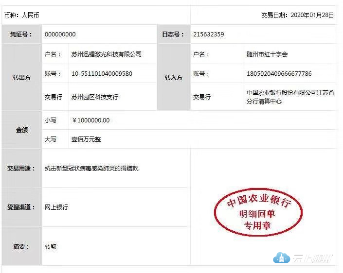 苏州迅镭激光科技有限公司向我市红十字会捐赠100万元现金。该公司捐赠的消毒液8吨,口罩4万只、医用手套15万双、防护眼镜3000副、鞋套4万只、帽子1.8万只等物资于今天抵达随州抗疫一线。 记者:方勇 编辑:刘欣明 责编:钱思雪 审核:陈凡 鲁京京