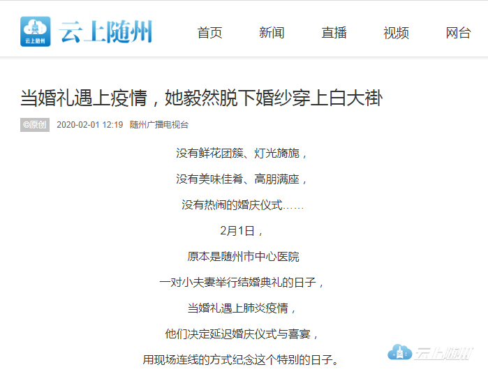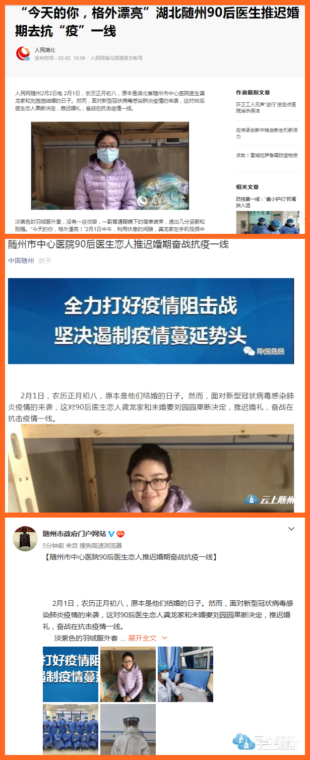 昨晚,湖北卫视新闻联播报道播出了《救援一线的“天使”》,其中,随州市中心医院的一对小夫妻为抗击疫情延迟婚礼的事迹,一经播出后,在全省上下引发强烈关注,大家被这对舍小爱为大爱的白衣战士所感动。
