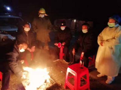 1月30日晚上,天寒地冻,高城镇公路劝返点工作人员仍在公路旁值班值守,利用炭火取暖。(包玲玲)