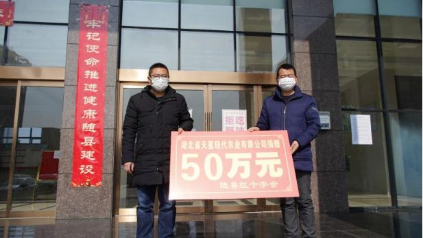 1月30日,湖北省天星现代农业有限公司向随县红十字会捐赠50万元,用于抗击新型冠状病毒感染的肺炎疫情。(邹薇、张伟、姜群)