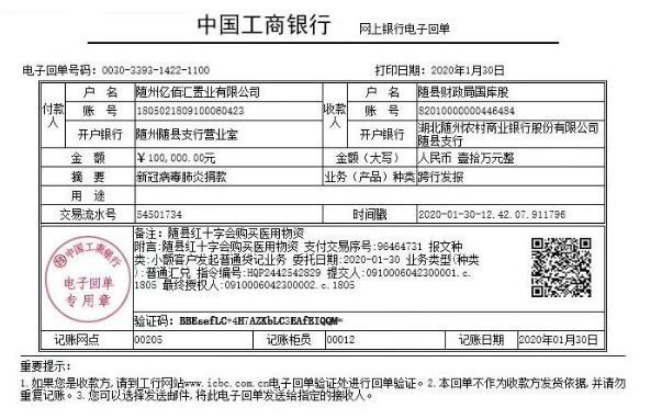 1月30日,随州亿佰汇置业有限公司(神农外滩首府)向随县红十字会捐赠了10万元爱心款,用于新型冠状病毒感染的肺炎防控物资的采购,助力打赢疫情防控阻击战。(戴洋)