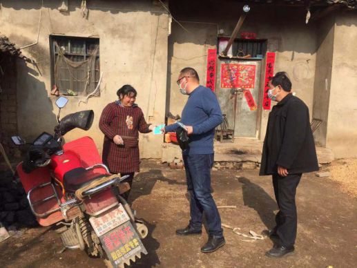 1月30日,随县县委宣传部负责人到澴潭镇玉皇阁村了解疫情防控情况,并给该村送去口罩、防控宣传标语等。(邱小虎)
