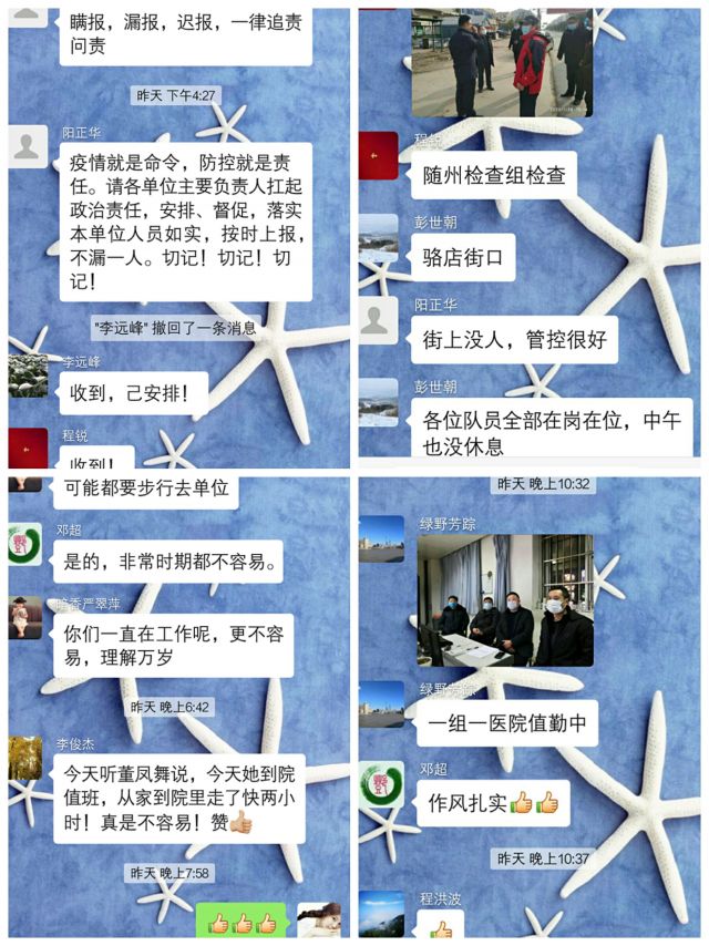 法院负责人带领干警冲锋陷阵,奔赴广水市疫情防控和普法工作的最前线。分别派员在广水市各指定发热门诊24小时轮流值守,并完成排查病人的接送任务;对各交通要道进行重点布控,做好来往人员车辆的宣传教育和劝还工作;深入社区、街道和扶贫村等地,配合当地干部及时掌握群众身体状况,入户开展防控宣传活动。在路口村口设置路障,防止人员流动交叉感染;组织青年干警成立广水法院防疫志愿服务队,接受广水市各种疫情防控任务。
