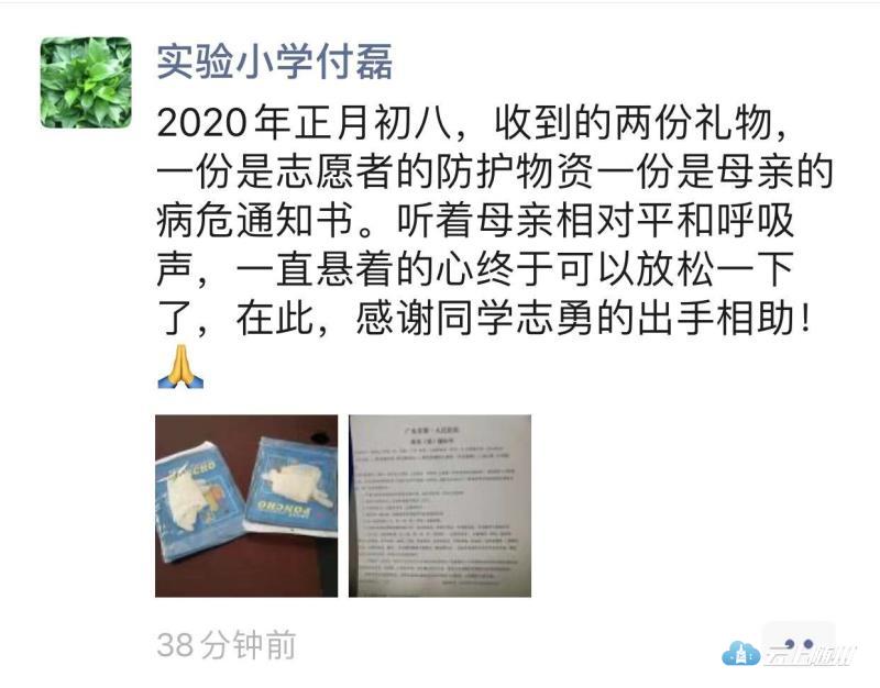 广水市实验小学志愿者付磊的朋友圈,看完让人泪目。付磊同志像我们现在正奋战在一线的志愿者一样,克服重重困难,积极投身到志愿者工作,连续多天坚守在包保路口劝导行人,家里的老母亲和孩子没法顾及。这时候哪里有什么“大家”“小家”之分,大小都是家,都需要我们去守护。挺在一线志愿者们早已经把个人安危放在一边,心里装的只有志愿者精神“奉献、友爱、互助、进步”。