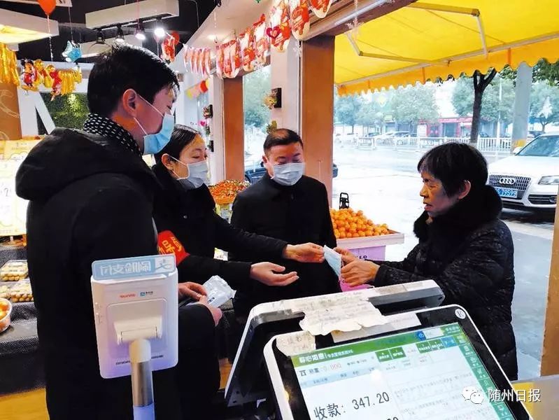 曾都区西城办事处工作人员向沿街店铺店员、菜贩、居民发放口罩,讲解正确戴口罩的方法,宣传新型冠状病毒防控知识。