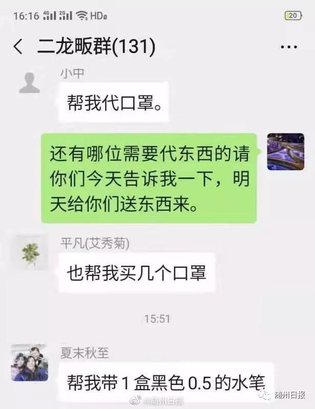在随县万和镇合河村村民交流群,村党支部书记何宇一声吆喝,村民纷纷说出自己最近紧缺的生活用品,村干部统计之后集中到镇上采购,然后送货上门,尽量避免群众外出,减少病毒传播途径!