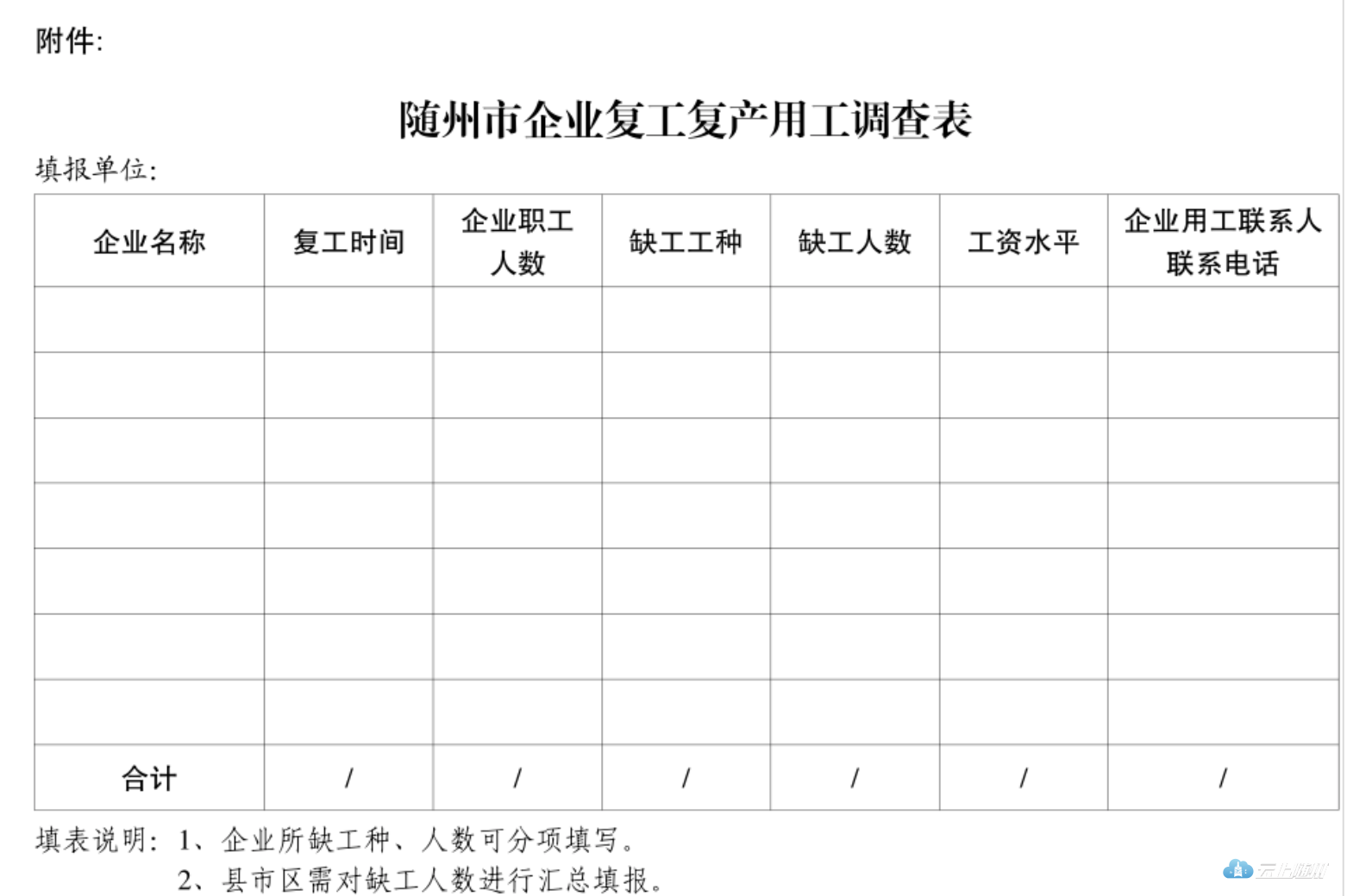 一、为便于信息发布、推送及用工精准对接,请各用工企业如实填写《随州市企业复工复产用工调查表》