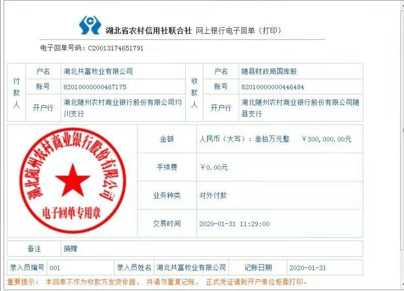 湖北共富牧业公司为随县红十字会捐款30万元,为随县疫情防控工作积极奉献爱心 。