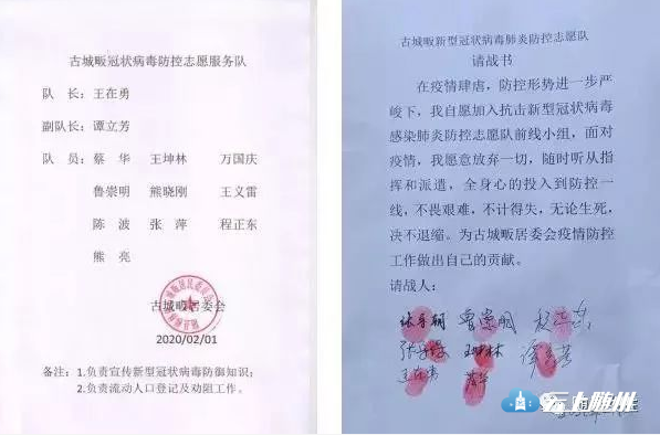 自疫情开始蔓延,随县柳林镇古城畈村居委会妇联主席谭立芳就和同事写下请战书,主动投入到抗战一线,“不求回报,尽其所能,不获全胜,绝不收兵”成为她的铮铮誓言。