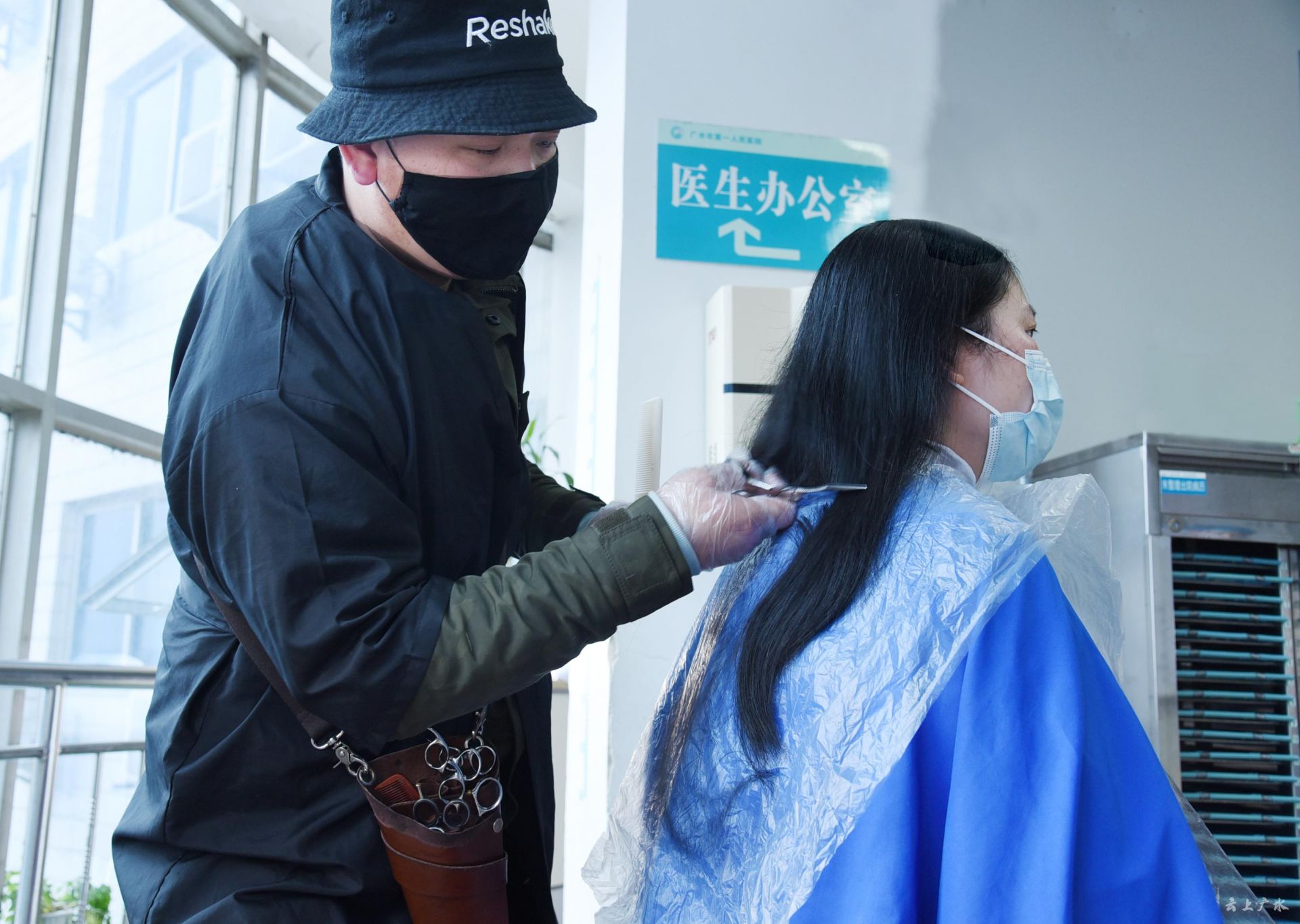 2月2日,广水一医院住院部大楼几乎腾空,改造为发热病人隔离病区, 170余名医务人员就地转换为抗疫战场一线的一员。为了把全部精力投入工作,方便穿着防护服,10余名护士小姐姐们放弃长发齐腰,忍痛自愿剪去长长的头发。