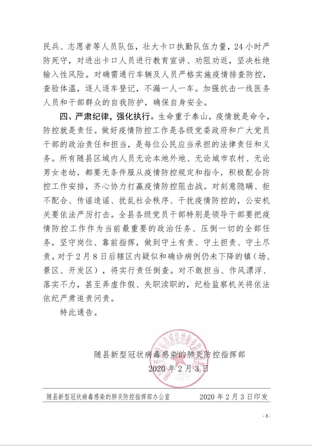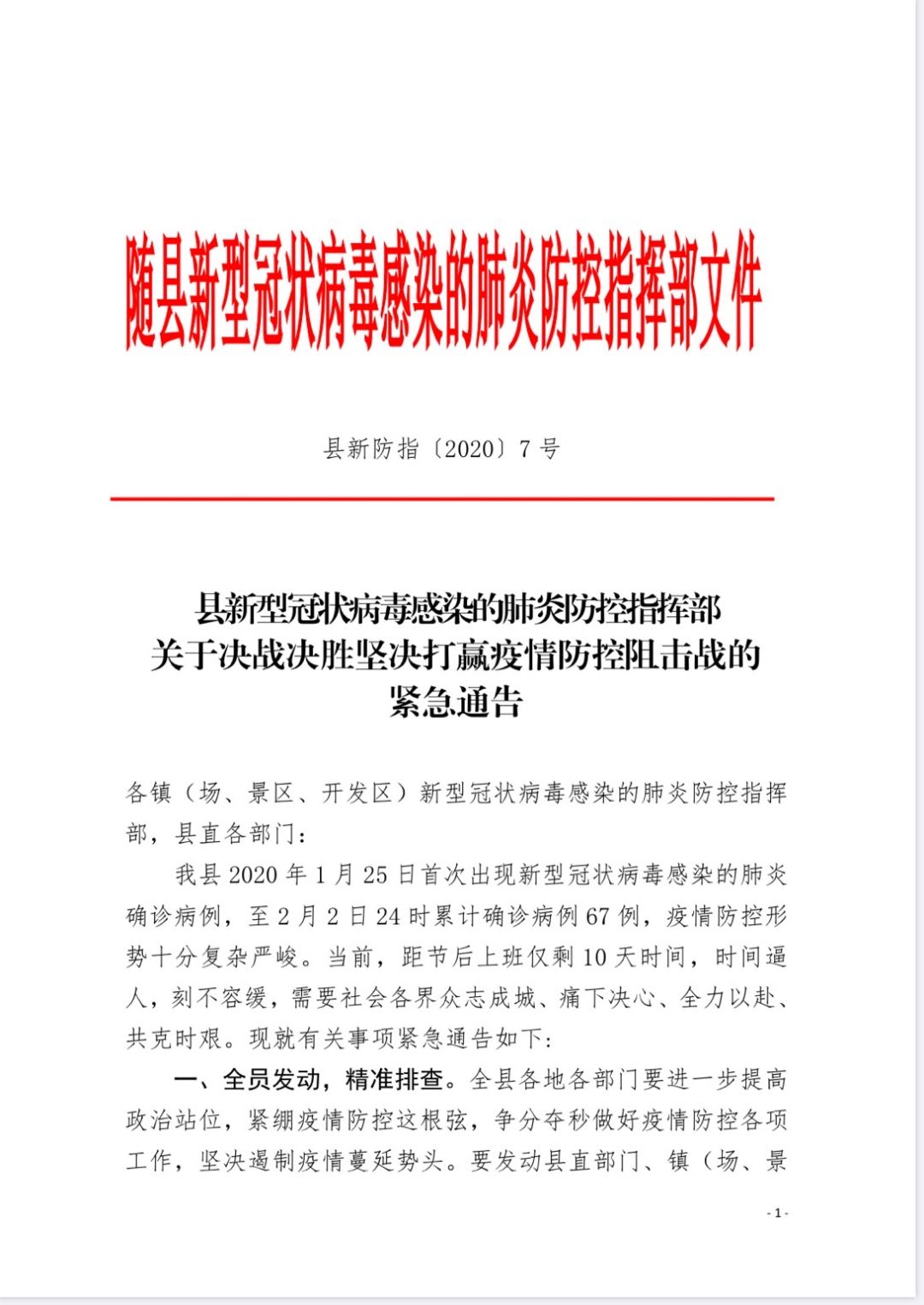 随县新型冠状病毒感染的肺炎防控指挥部 关于决战决胜坚决打赢疫情防控阻击战的 紧急通告
