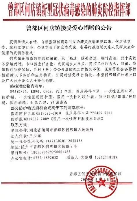 何店镇是随南的交通枢纽镇,汉十高速、随岳高速、麻竹高速、汉十高铁等穿境而过,卡口排查任务重,武汉返乡人员多,防控工作压力大。目前,我镇医疗物资紧缺,各村(居)委会开展防控工作极其不便,现急需社会各界积极捐赠以下防护和应急物资,并同时接受社会捐款,希望何店镇在外老乡以及广大社会爱心人士提供捐赠。