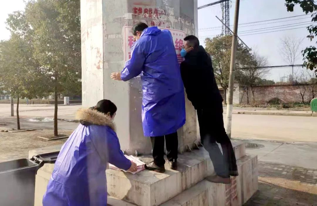 曾都区委政法委机关干部协助社区工作人员张贴宣传标语