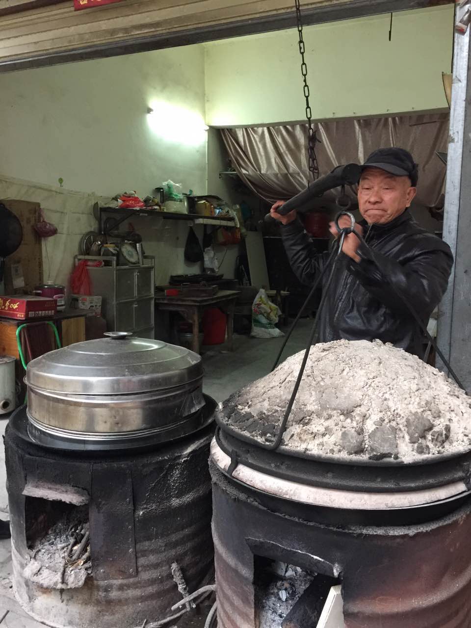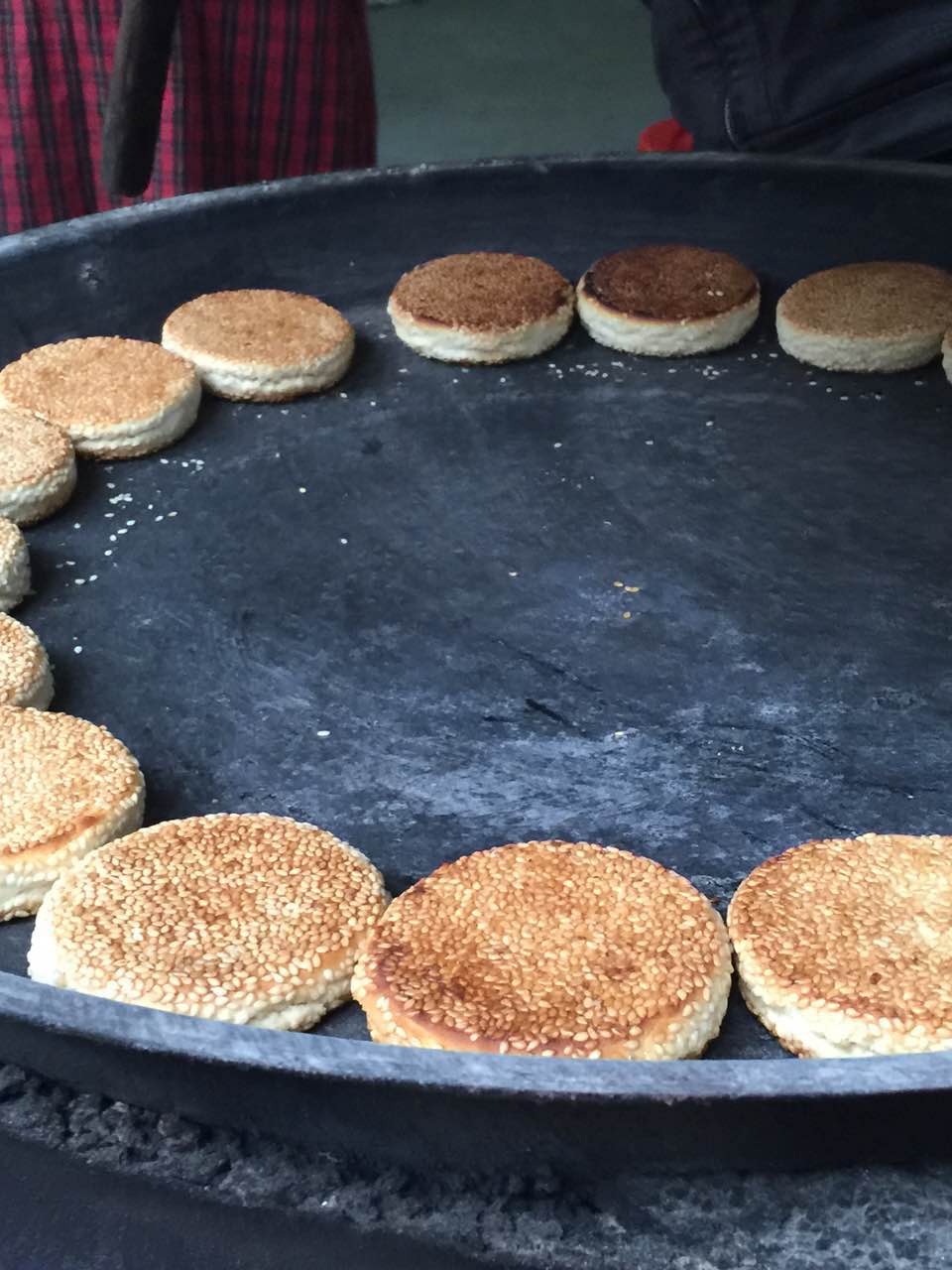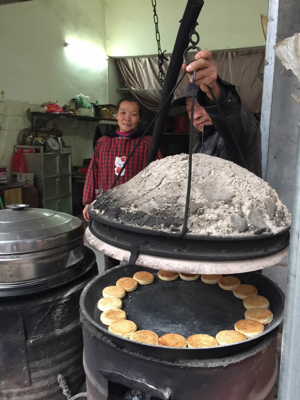 江家义家住殷店镇朱店老街,今年63岁。来到他家门前,马上被一股喷香的气味给吸引,家门口放着一口大黑锅,喜饼正要出锅,打开锅盖,焦黄浑圆的喜饼令人生馋。据江家义介绍,自小从祖父那里学习做喜饼的技术,至今已经做了40多年了。