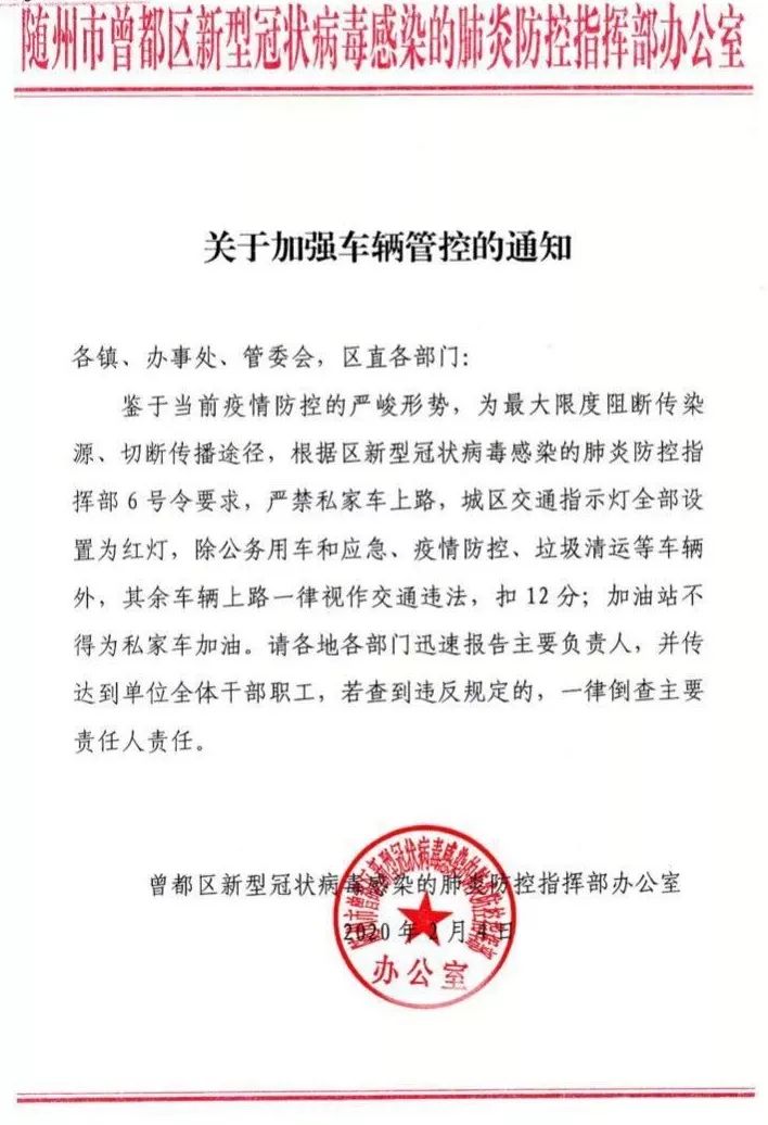 曾都区新型肺炎防控办:关于加强车辆管控的通知