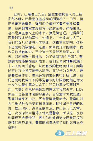 “我们恋爱时,我曾许下的承诺‘春节好好陪你’仍然在你又一次的失望中再次失言了!我只能再次说声对不起,老婆!你已经无数次的原谅了我的失言,因为你是一位善良体贴的好妻子。”这是一封抗疫一线民警写给妻子的家书,信中,这位民警道出了自己对妻子的满满愧疚。