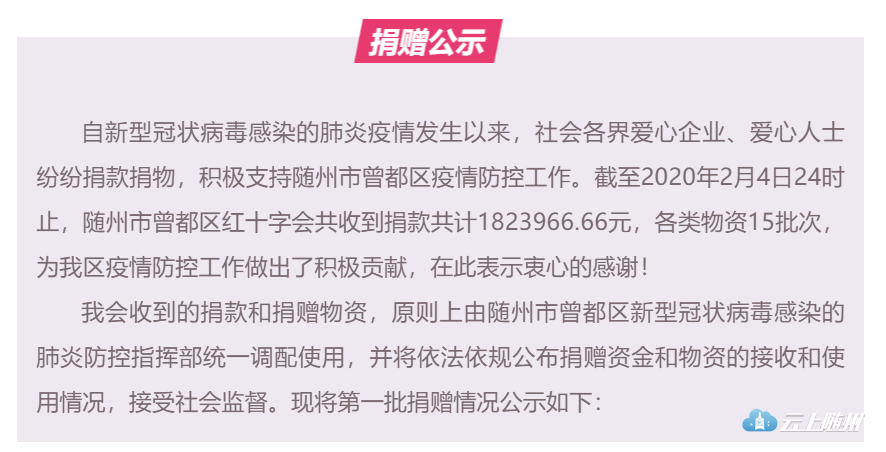 经曾都区新型冠状病毒感染的肺炎疫情防控指挥部批准,新设置曾都区红十字会募捐专用账号,用于接收全社会各界人士的爱心捐款。原募捐账号17780401040000339暂停使用。