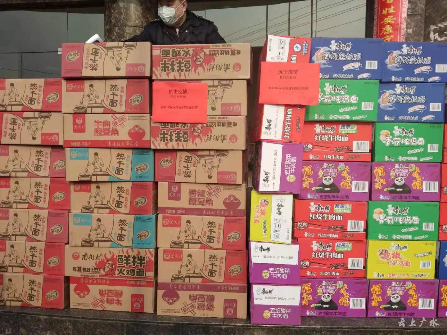 在长岭医院、广水市一医院、广水市疾控中心,广水市委统战部和金海国际家居建材广场的工作人员戴着口罩从车上搬下价值12000元的泡面、热干面,堆放成一面面“爱心墙”••••••
