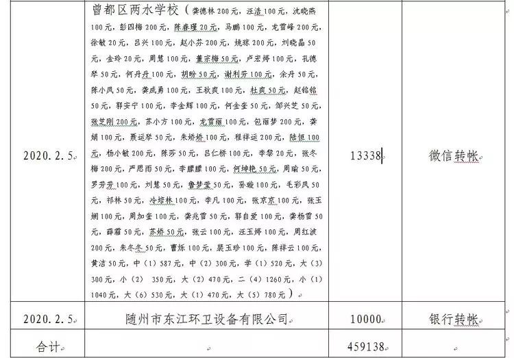 截至2月5日18时,曾都经济开发区共收到新型肺炎疫情防控物资4批、防控经费459138元(明细附后),现予公示并接受社会监督(排名不分先后和金额多少)。如有任何疑问,请联系曾都经济开发区新型冠状病毒感染的肺炎防控指挥部办公室。