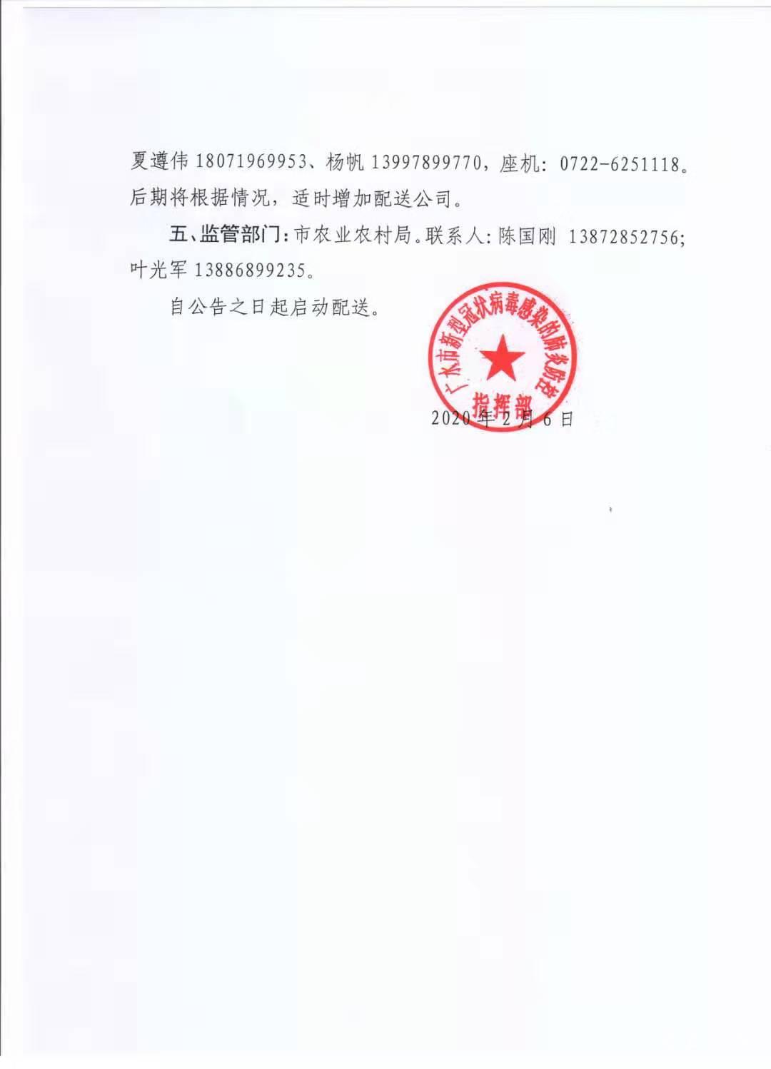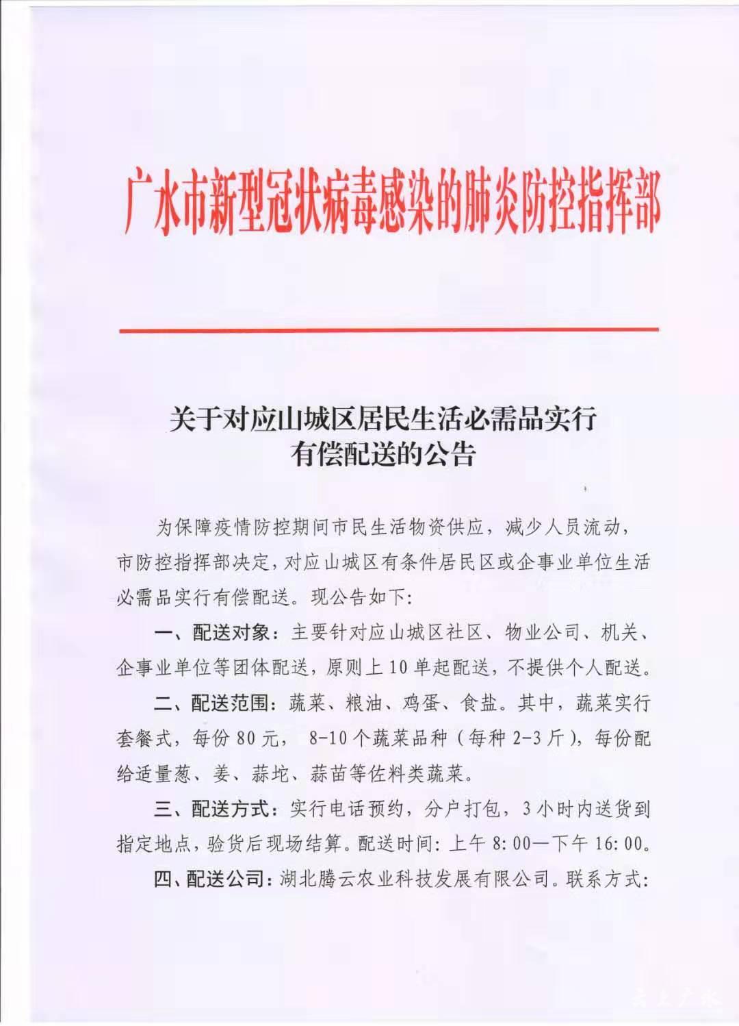 广水市新型冠状病毒感染的肺炎防控指挥部关于对应山城区居民生活必需品实行有偿配送的公告