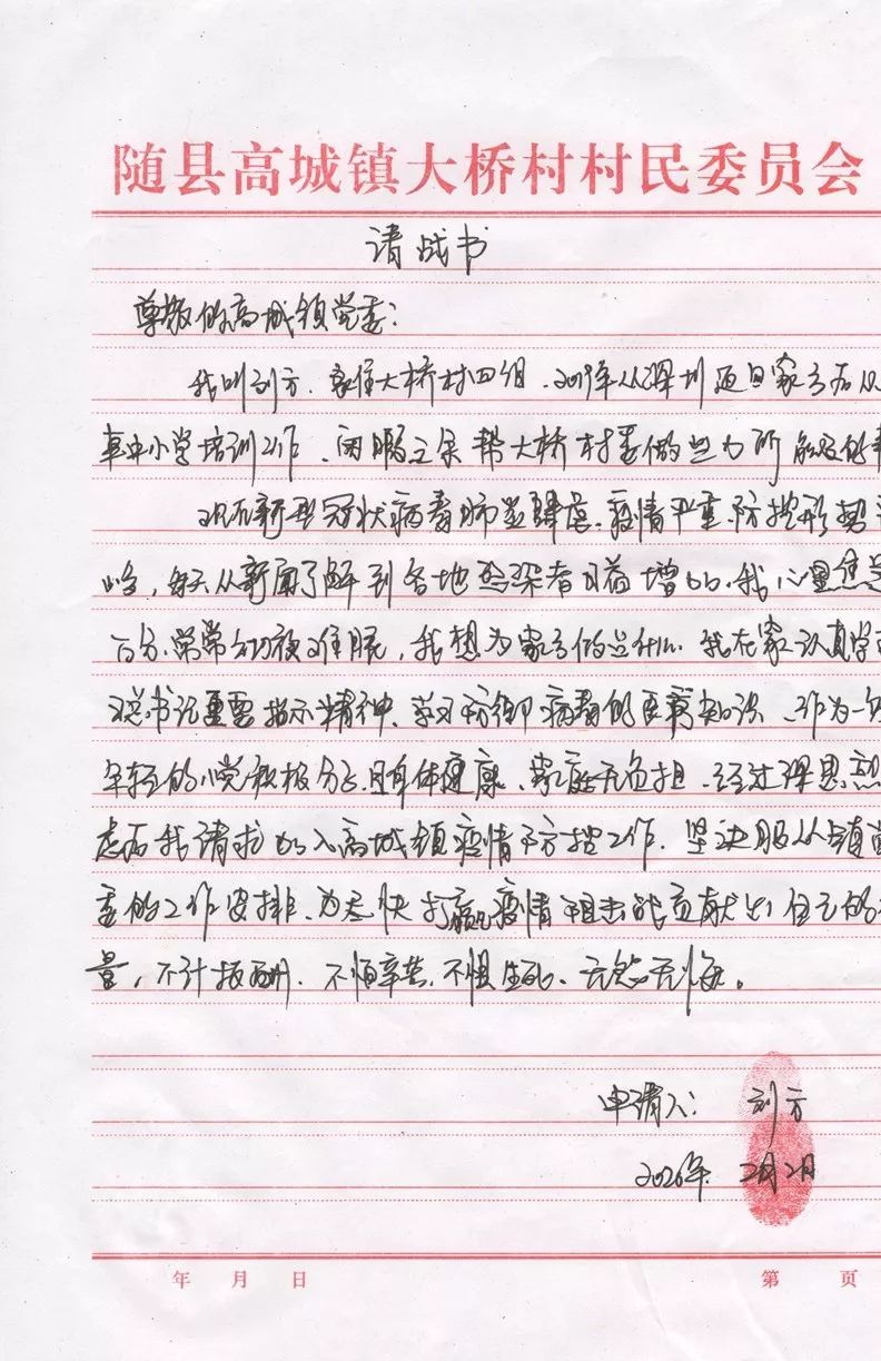 2月2日上午,镇办公室来了一位“不速之客”,瘦瘦高高的个子,穿着朴素,带着口罩。走进门,这位“不速之客”二话没说就向办公室人员递上了一份“请战书”。