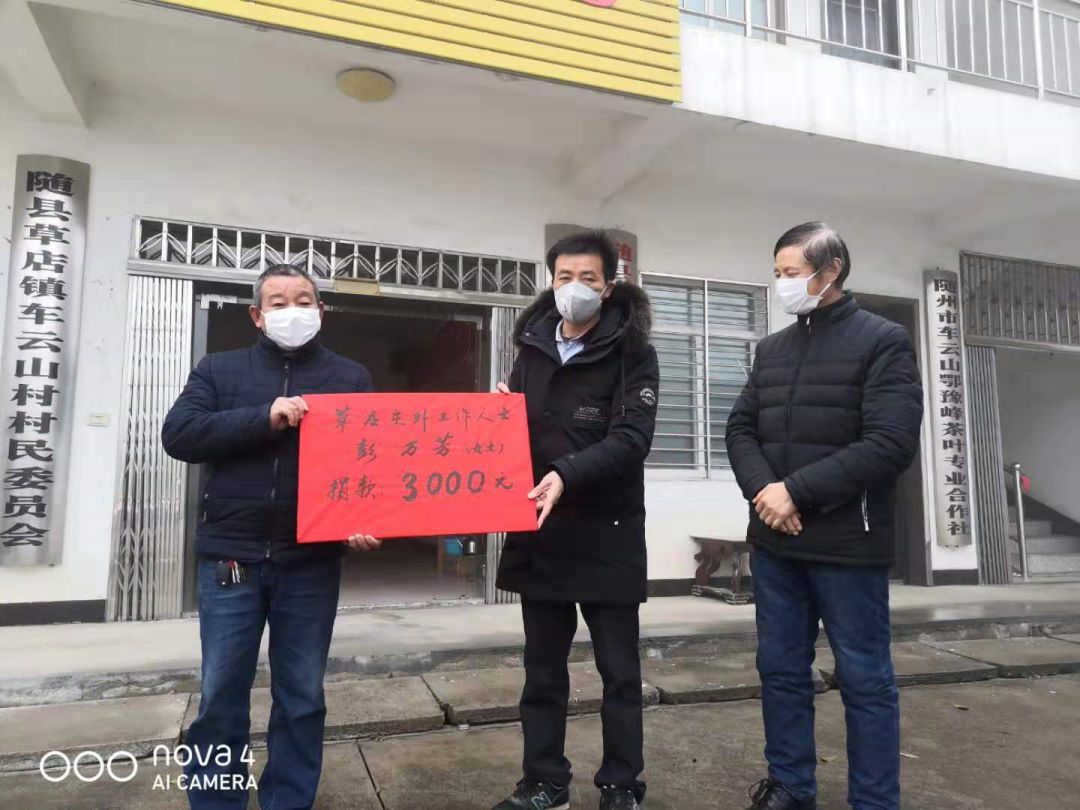 彭万芳,原籍随县草店镇人,大学毕业后一直工作在外地,现已退休住在深圳,系草店镇文化服务中心负责人家属吴春霞初中时期同窗好友。2月6日下午,两位同学在微信中聊天,她得知家乡草店镇疫情形势严紧,防控物资短缺后,当即转账3000元给草店镇文化中心,由其代为转交家乡用于支援家乡抗击疫情。2月7日,经与彭女士协商,草店镇文化中心将3000元现金转交给车云山村委会,用于支援该村抗击疫情。