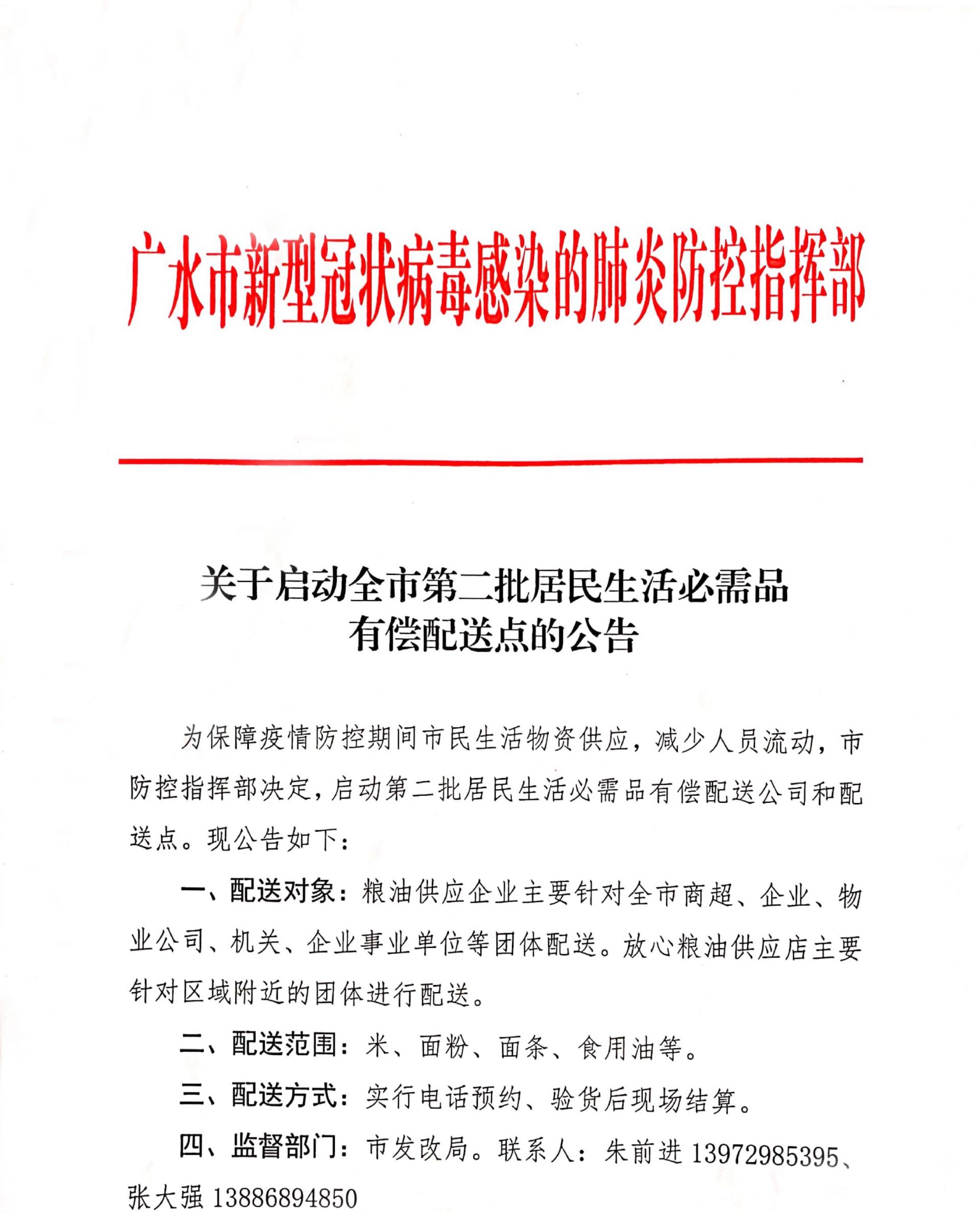 广水市新型冠状病毒感染的肺炎防控指挥部关于启动全市第二批居民生活必需品有偿配送点的公告