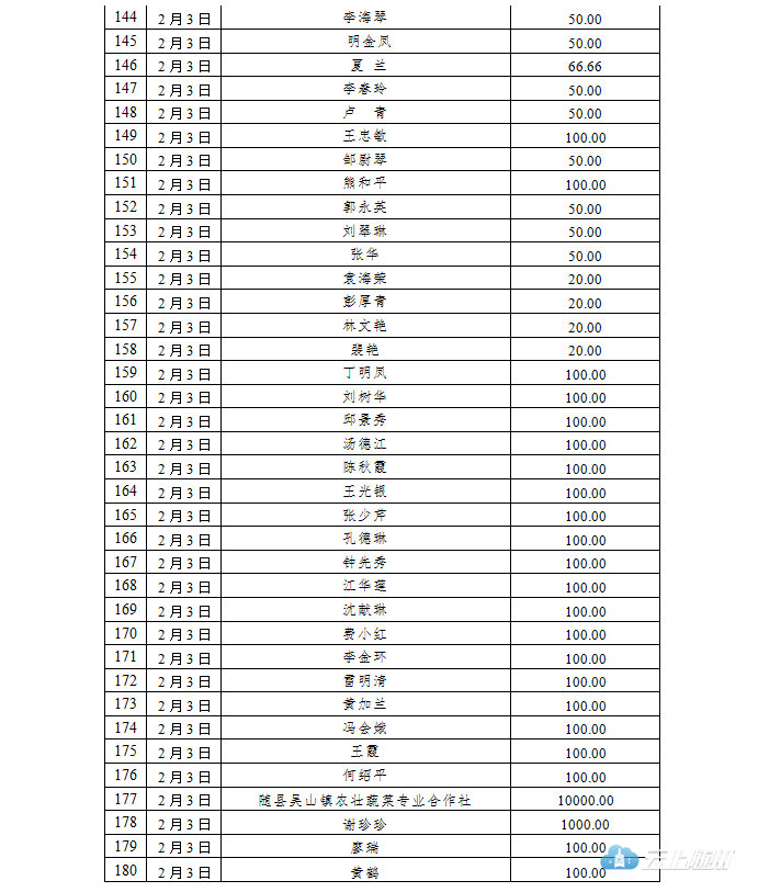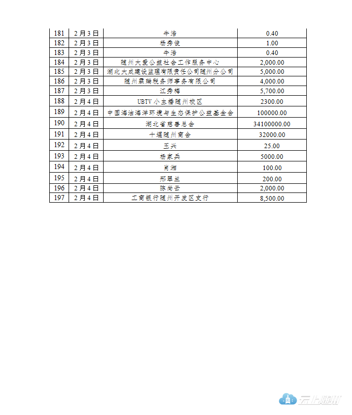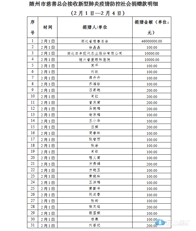 截至2020年2月4日24时,随州市慈善总会接收疫情防控社会捐赠款共计18395.9万元,(含湖北省慈善总会划拨资金18301.9959万元)。其中2月1日至2月4日合计接收12663.2万元,明细见下表,欢迎社会各界监督。
