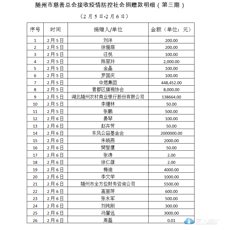 截至2020年2月6日24时,随州市慈善总会接收疫情防控社会捐赠款共计18657.48万元,(含湖北省慈善总会划拨资金18301.9959万元)。其中2月5日至2月6日合计接收2615470元,明细见下表,欢迎社会各界监督。