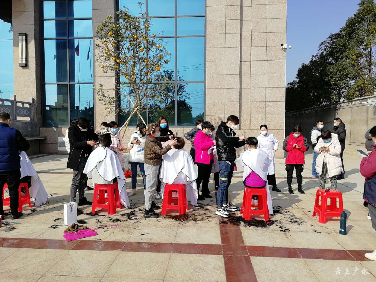 2月8日中午,支援广水市的江西医疗队27名女性工作队员集体理发,为打赢防控阻击战做好准备,随时上岗救治患者。