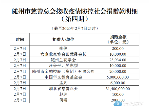 截至2020年2月7日24时,市慈善总会共接收捐赠款累计22304.70万元(含省慈善总会拨付资金21442万元)。接收捐赠款中,定向捐赠648.80 万元,非定向捐赠21655.90万元。2月7日新增社会捐赠3647.22万元(含省慈善总会新增拨付资金3140万元),其中新增定向捐赠502.00 万元,非定向捐赠3145.22万元,明细见下表,欢迎社会各界监督。