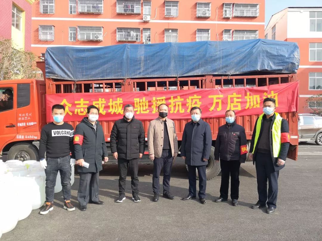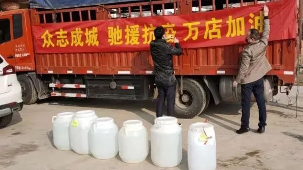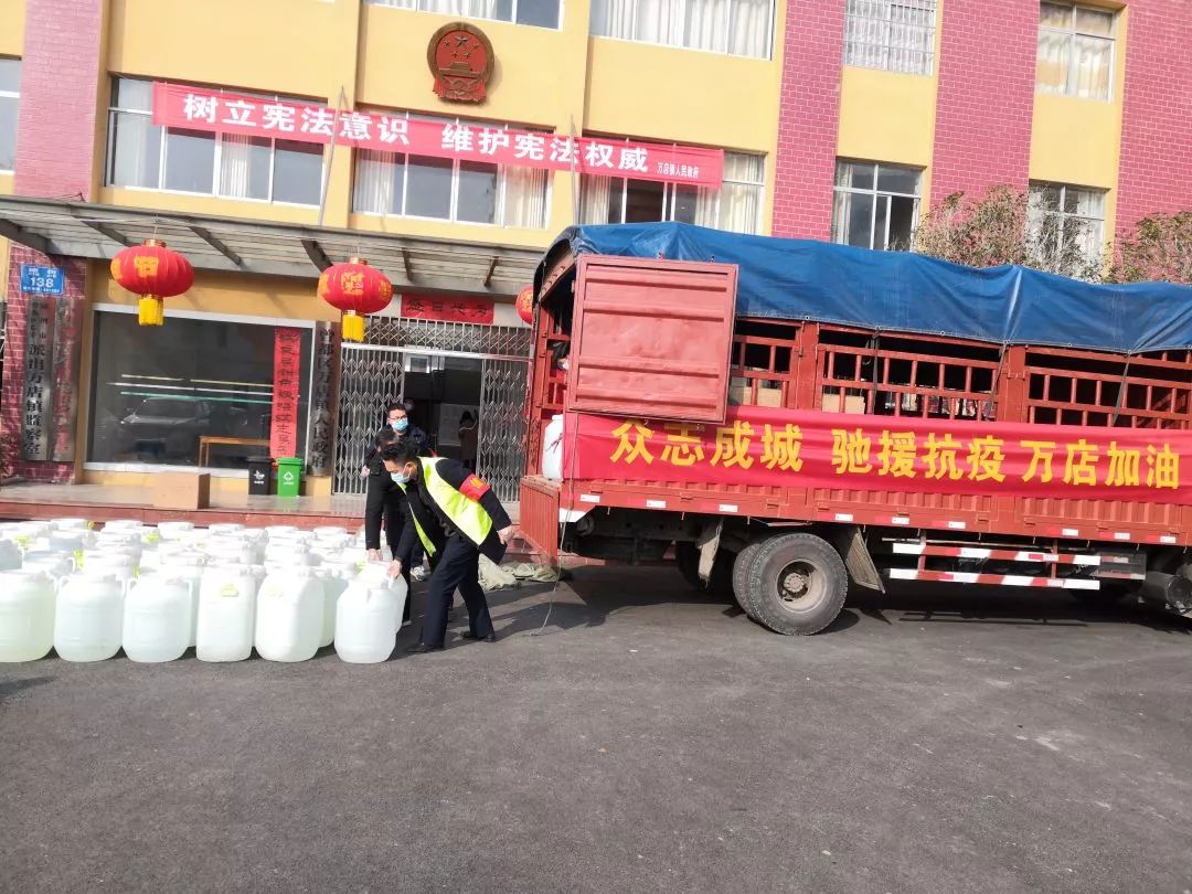 2月8日,一辆特殊的货车驶入万店镇政府大院,车里满载着7吨消毒液和2000个口罩,车上挂着醒目的横幅,上面写道:“众志成城,驰援抗疫,万店加油。”