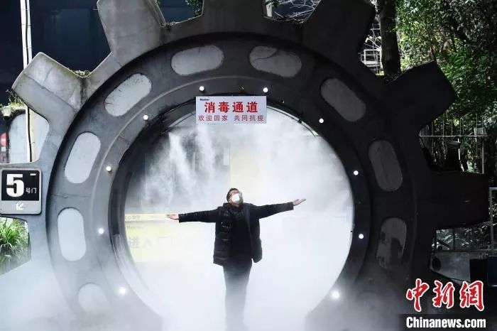 图为企业值班人员经过自动喷雾消毒装置处。 陈超 摄